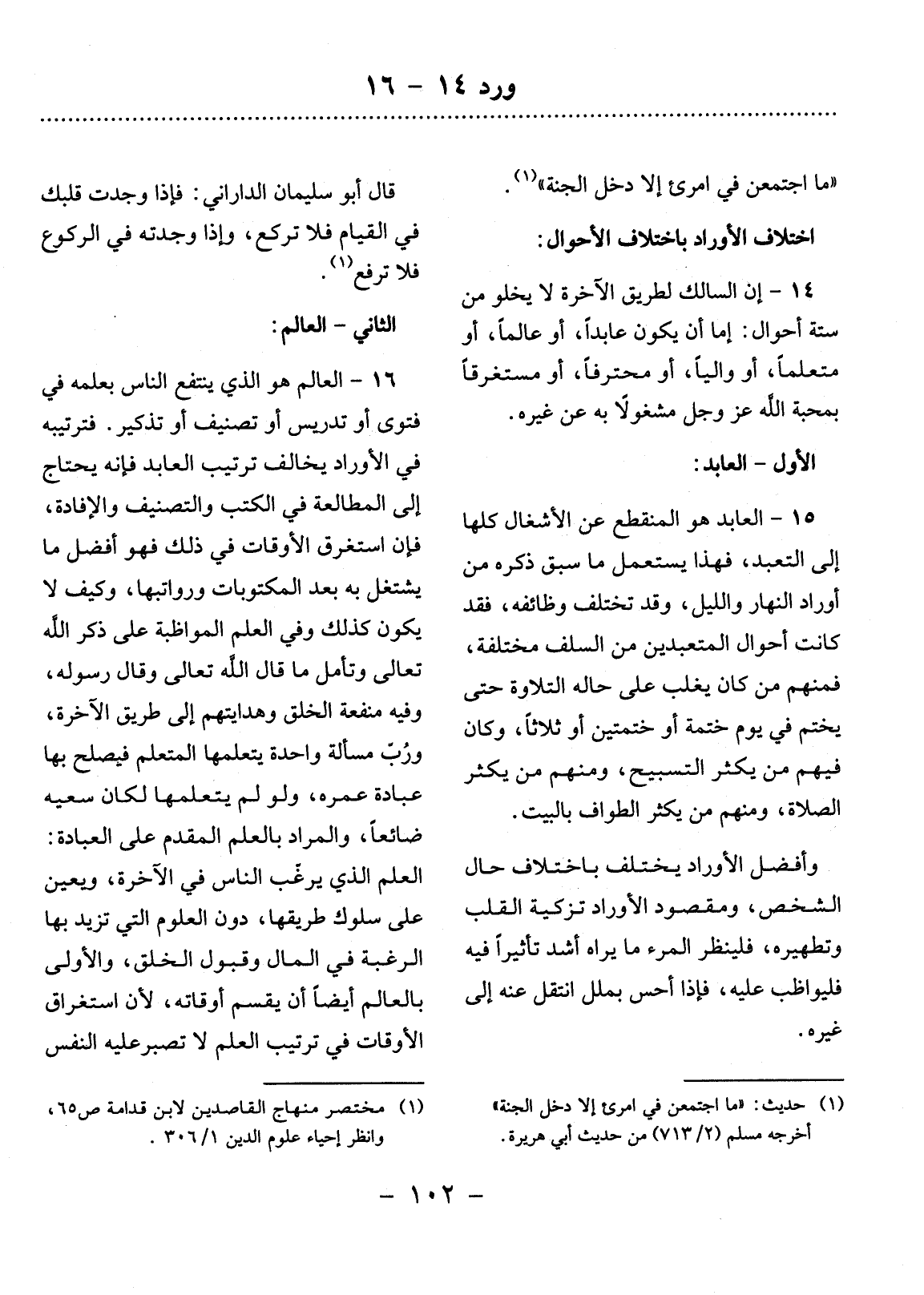 14 - إِنَّ السَّالِكَ لِطَرِيقِ الآْخِرَةِ لاَ يَخْلُو مِنْ سِتَّةِ أَحْوَالٍ: إِمَّا أَنْ يَكُونَ عَابِدًا، أَوْ عَالِمًا، أَوْ مُتَعَلِّمًا، أَوْ وَالِيًا، أَوْ مُحْتَرِفًا، أَوْ مُسْتَغْرِقًا بِمَحَبَّةِ اللَّهِ عَزَّ وَجَل مَشْغُولاً بِهِ عَنْ غَيْرِهِ.