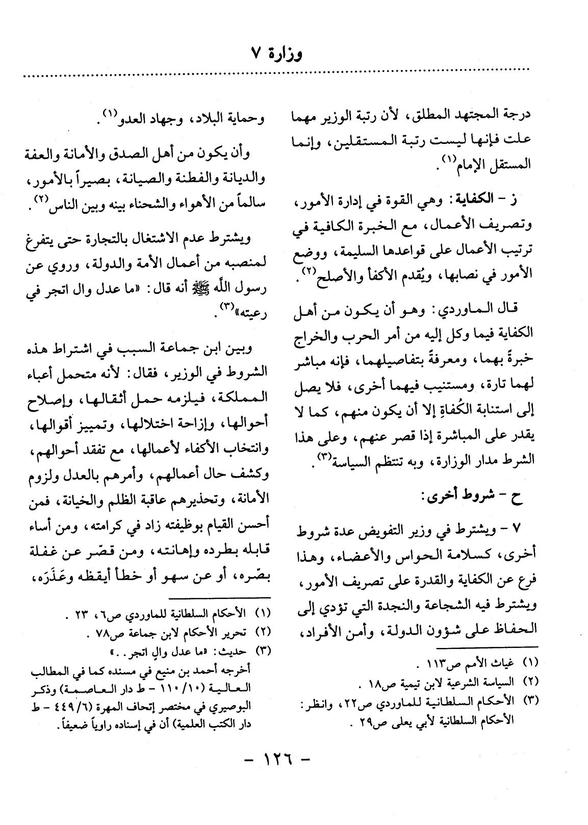 7 ـ وَيُشْتَرَطُ فِي وَزِيرِ التَّفْوِيضِ عِدَّةُ شُرُوطٍ أُخْرَى، كَسَلاَمَةِ الْحَوَاسِّ وَالأَْعْضَاءِ، وَهَذَا فَرْعٌ عَنِ الْكِفَايَةِ وَالْقُدْرَةِ عَلَى تَصْرِيفِ الأُْمُورِ، وَيُشْتَرَطُ فِيهِ الشَّجَاعَةُ وَالنَّجْدَةُ الَّتِي تُؤَدِّي إِلَى الْحِفَاظِ عَلَى شُئُونِ الدَّوْلَةِ، وَأَمْنِ الأَْفْرَادِ،
