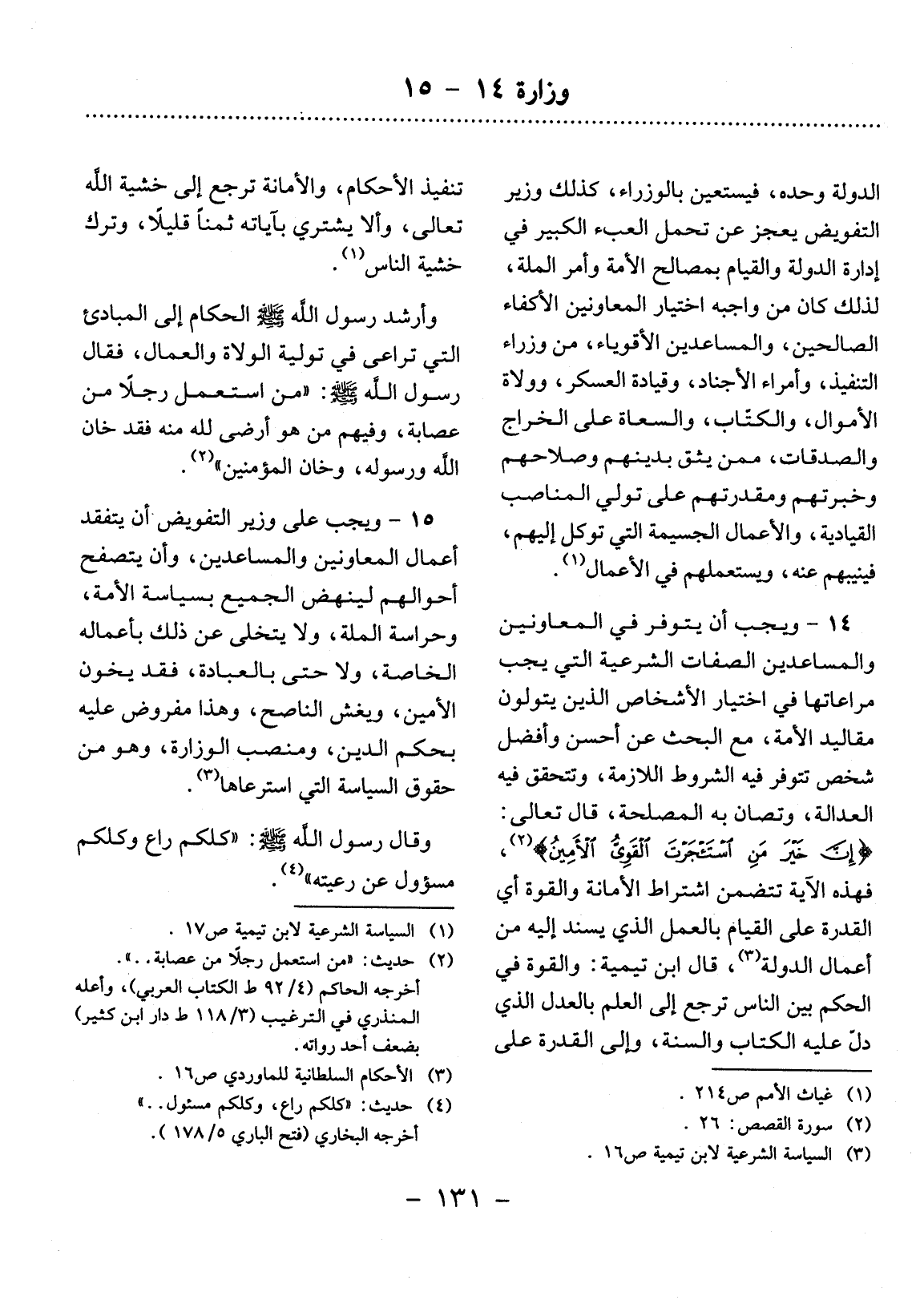 14 - وَيَجِبُ أَنْ يَتَوَفَّرَ فِي الْمُعَاوِنِينَ وَالْمُسَاعِدِينَ الصِّفَاتُ الشَّرْعِيَّةُ الَّتِي يَجِبُ مُرَاعَاتُهَا فِي اخْتِيَارِ الأَْشْخَاصِ الَّذِينَ يَتَوَلَّوْنَ مَقَالِيدَ الأُْمَّةِ، مَعَ الْبَحْثِ عَنْ أَحْسَنِ وَأَفْضَل شَخْصٍ تَتَوَفَّرُ فِيهِ الشُّرُوطُ اللاَّزِمَةُ، وَتَتَحَقَّقُ فِيهِ الْعَدَالَةُ، وَتُصَانُ بِهِ الْمَصْلَحَةُ، قَال تَعَالَى: {إِنَّ خَيْرَ مَنِ اسْتَأْجَرْتَ الْقَوِيُّ الأَْمِينُ (2) } ، فَهَذِهِ الآْيَةُ تَتَضَمَّنُ اشْتِرَاطَ الأَْمَانَةِ وَالْقُوَّةِ أَيِ الْقُدْرَةِ عَلَى الْقِيَامِ بِالْعَمَل الَّذِي يُسْنَدُ إِلَيْهِ مِنْ أَعْمَال الدَّوْلَةِ (3) ، قَال ابْنُ تَيْمِيَّةَ: وَالْقُوَّةُ فِي الْحُكْمِ بَيْنَ النَّاسِ تَرْجِعُ إِلَى الْعِلْمِ بِالْعَدْل الَّذِي دَل عَلَيْهِ الْكِتَابُ وَالسُّنَّةُ، وَإِلَى الْقُدْرَةِ عَلَى