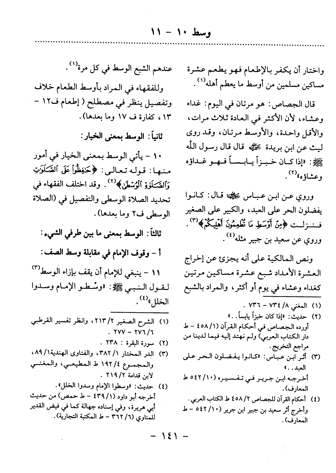 وَلِلْفُقَهَاءِ فِي الْمُرَادِ بِأَوْسَطِ الطَّعَامِ خِلاَفٌ وَتَفْصِيلٌ يُنْظَرُ فِي مُصْطَلَحِ (إِطْعَامٌ ف 12 - 13، كَفَّارَةٌ ف 17 وَمَا بَعْدَهَا) .