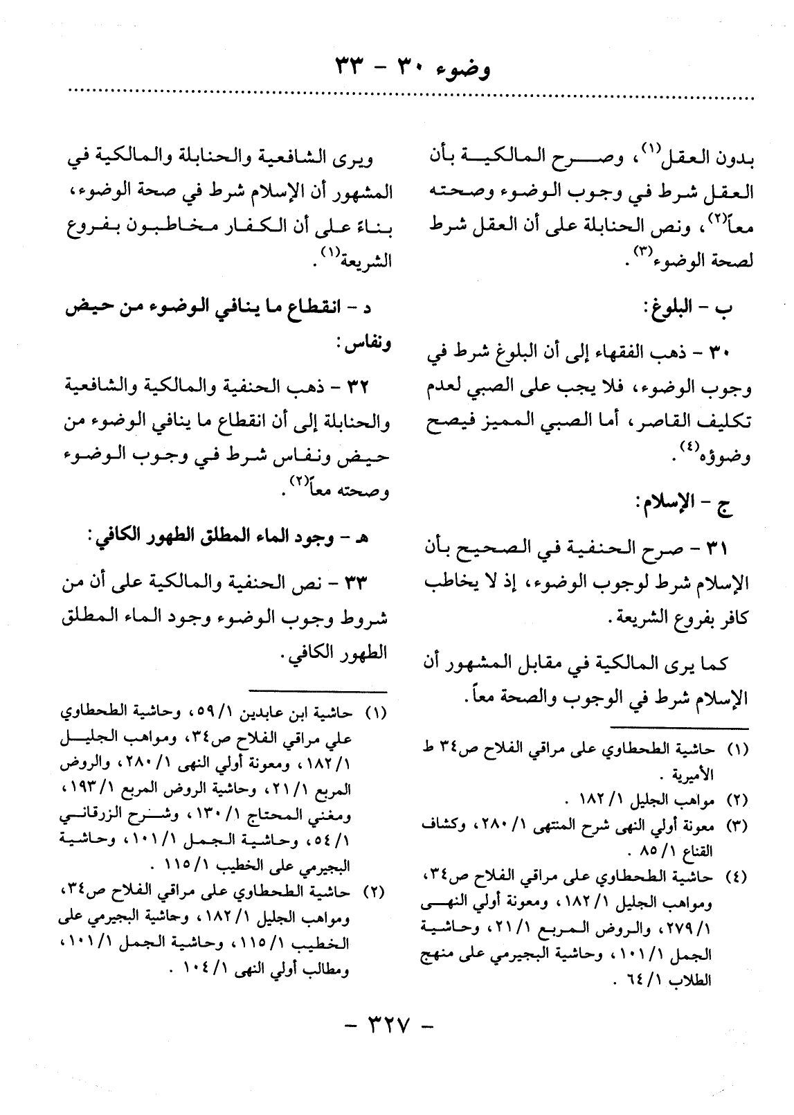 33 - نَصَّ الْحَنَفِيَّةُ وَالْمَالِكِيَّةُ عَلَى أَنَّ مِنْ شُرُوطِ وُجُوبِ الْوُضُوءِ وُجُودَ الْمَاءِ الْمُطْلَقِ الطَّهُورِ الْكَافِي.