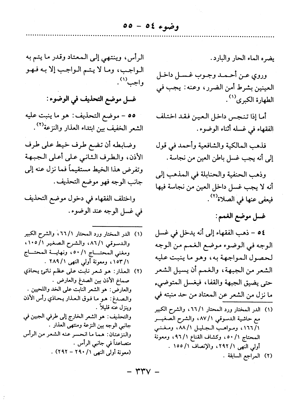 54 - ذَهَبَ الْفُقَهَاءُ إِلَى أَنَّهُ يَدْخُل فِي غَسْل الْوَجْهِ فِي الْوُضُوءِ مَوْضِعُ الْغَمَمِ مِنَ الْوَجْهِ؛ لِحُصُول الْمُوَاجَهَةِ بِهِ، وَمَوْضِعُ الْغَمَمِ هُوَ مَا يَنْبُتُ عَلَيْهِ الشَّعْرُ مِنَ الْجَبْهَةِ، وَالْغَمَمُ أَنْ يَسِيل الشَّعْرُ حَتَّى يَضِيقَ الْجَبْهَةُ وَالْقَفَا فَيَغْسِل الْمُتَوَضِّئُ مَا نَزَل مِنَ الشَّعْرِ عَنِ الْمُعْتَادِ مِنْ حَدِّ مَنْبَتِهِ فِي