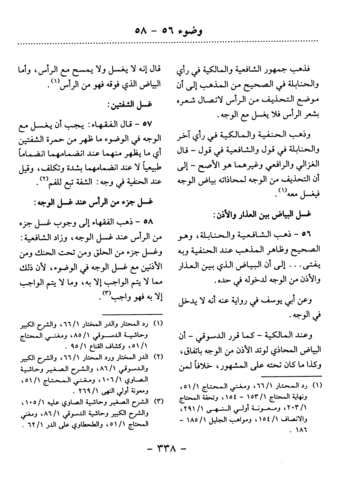 58 - ذَهَبَ الْفُقَهَاءُ إِلَى وُجُوبِ غَسْل جُزْءٍ مِنَ الرَّأْسِ فِي غَسْل الْوَجْهِ، وَزَادَ الشَّافِعِيَّةُ: وَغَسْل جُزْءٍ مِنَ الْحَلْقِ وَمِنْ تَحْتِ الْحَنَكِ وَمِنَ الأُْذُنَيْنِ مَعَ غَسْل الْوَجْهِ فِي الْوُضُوءِ؛ لأَِنَّ ذَلِكَ مِمَّا لاَ يَتِمُّ الْوَاجِبُ إِلاَّ بِهِ، وَمَا لاَ يَتِمُّ الْوَاجِبُ إِلاَّ بِهِ فَهُوَ وَاجِبٌ (3) .