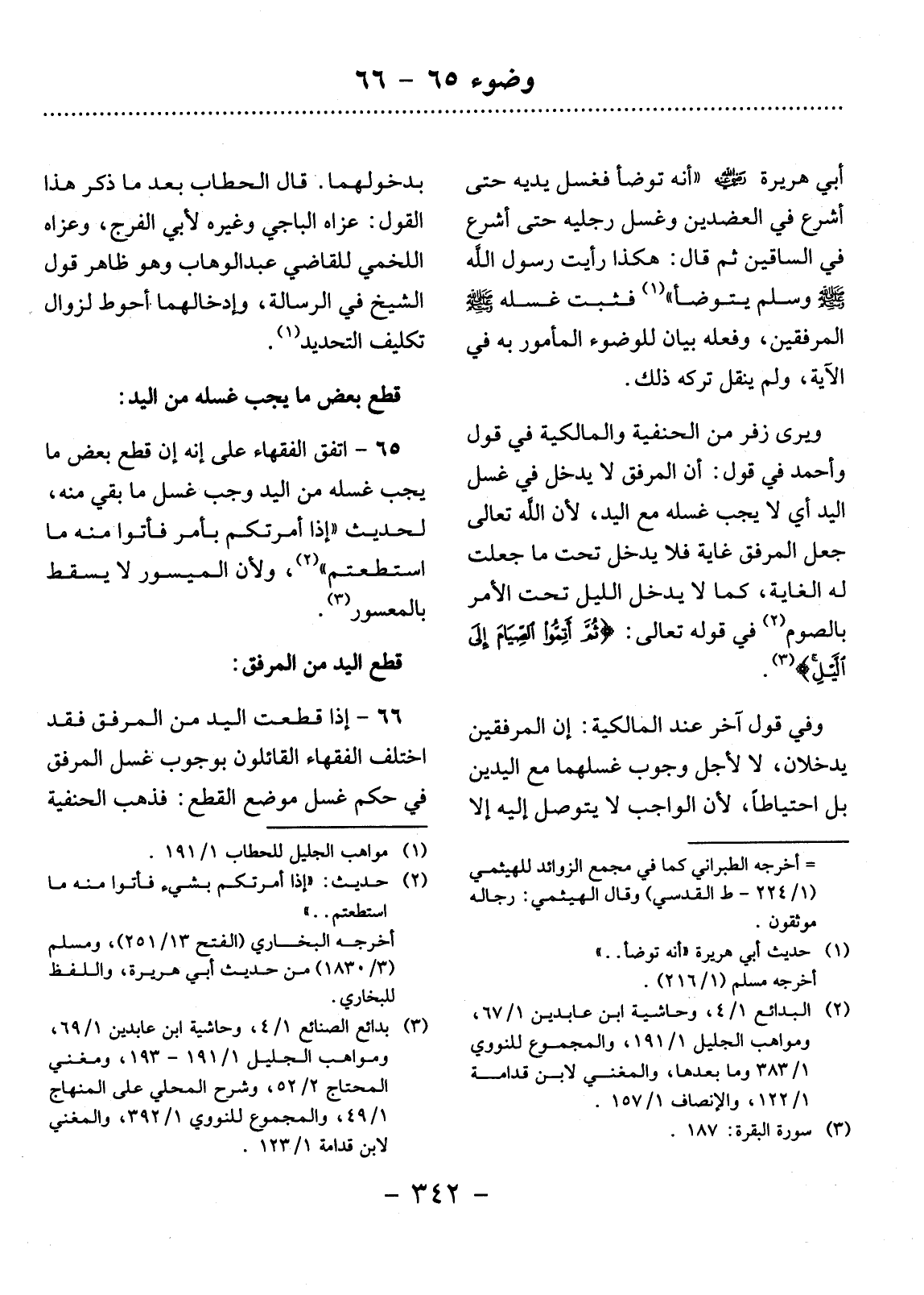 66 - إِذَا قُطِعَتِ الْيَدُ مِنَ الْمِرْفَقِ فَقَدِ اخْتَلَفَ الْفُقَهَاءُ الْقَائِلُونَ بِوُجُوبِ غَسْل الْمِرْفَقِ فِي حُكْمِ غَسْل مَوْضِعِ الْقَطْعِ: فَذَهَبَ الْحَنَفِيَّةُ
