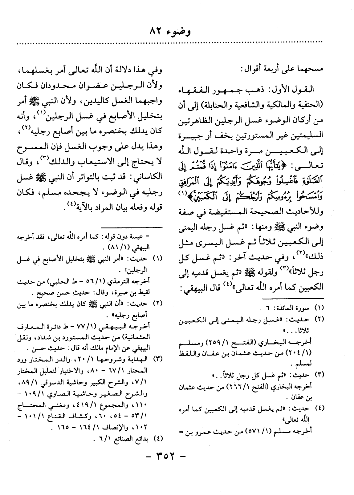 الْقَوْل الأَْوَّل: ذَهَبَ جُمْهُورُ الْفُقَهَاءِ (الْحَنَفِيَّةُ وَالْمَالِكِيَّةُ وَالشَّافِعِيَّةُ وَالْحَنَابِلَةُ) إِلَى أَنَّ مِنْ أَرْكَانِ الْوُضُوءِ غَسْل الرِّجْلَيْنِ الظَّاهِرَتَيْنِ السَّلِيمَتَيْنِ - غَيْرِ الْمَسْتُورَتَيْنِ بِخُفٍّ أَوْ جَبِيرَةٍ - إِلَى الْكَعْبَيْنِ مَرَّةً وَاحِدَةً؛ لِقَوْل اللَّهِ تَعَالَى: " {يَاأَيُّهَا الَّذِينَ آمَنُوا إِذَا قُمْتُمْ إِلَى الصَّلاَةِ فَاغْسِلُوا وُجُوهَكُمْ وَأَيْدِيَكُمْ إِلَى الْمَرَافِقِ وَامْسَحُوا بِرُءُوسِكُمْ وَأَرْجُلَكُمْ إِلَى الْكَعْبَيْنِ} " (1) وَلِلأَْحَادِيثِ الصَّحِيحَةِ الْمُسْتَفِيضَةِ فِي صِفَةِ وُضُوءِ النَّبِيِّ صَلَّى اللَّهُ عَلَيْهِ وَسَلَّمَ وَمِنْهَا: ثُمَّ غَسَل رِجْلَهُ الْيُمْنَى إِلَى الْكَعْبَيْنِ ثَلاَثًا ثُمَّ غَسَل الْيُسْرَى مِثْل ذَلِكَ (2) ، وَفِي حَدِيثٍ آخَرَ ثُمَّ غَسَل كِلْتَا رِجْلَيْهِ ثَلاَثًا (3) وَلِقَوْلِهِ صَلَّى اللَّهُ عَلَيْهِ وَسَلَّمَ: ثُمَّ يَغْسِل قَدَمَيْهِ إِلَى الْكَعْبَيْنِ كَمَا أَمَرَهُ اللَّهُ تَعَالَى (4) قَال الْبَيْهَقِيُّ: