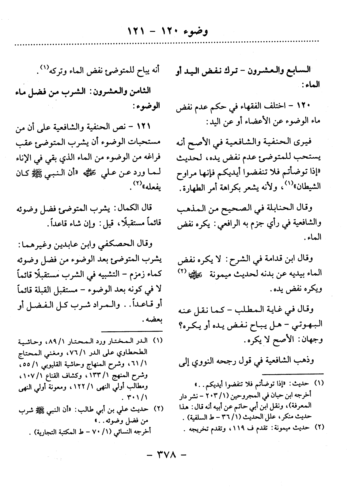 120 ـ اخْتَلَفَ الْفُقَهَاءُ فِي حُكْمِ عَدَمِ نَفْضِ مَاءِ الْوُضُوءِ عَنِ الأَْعْضَاءِ أَوْ عَنِ الْيَدِ: