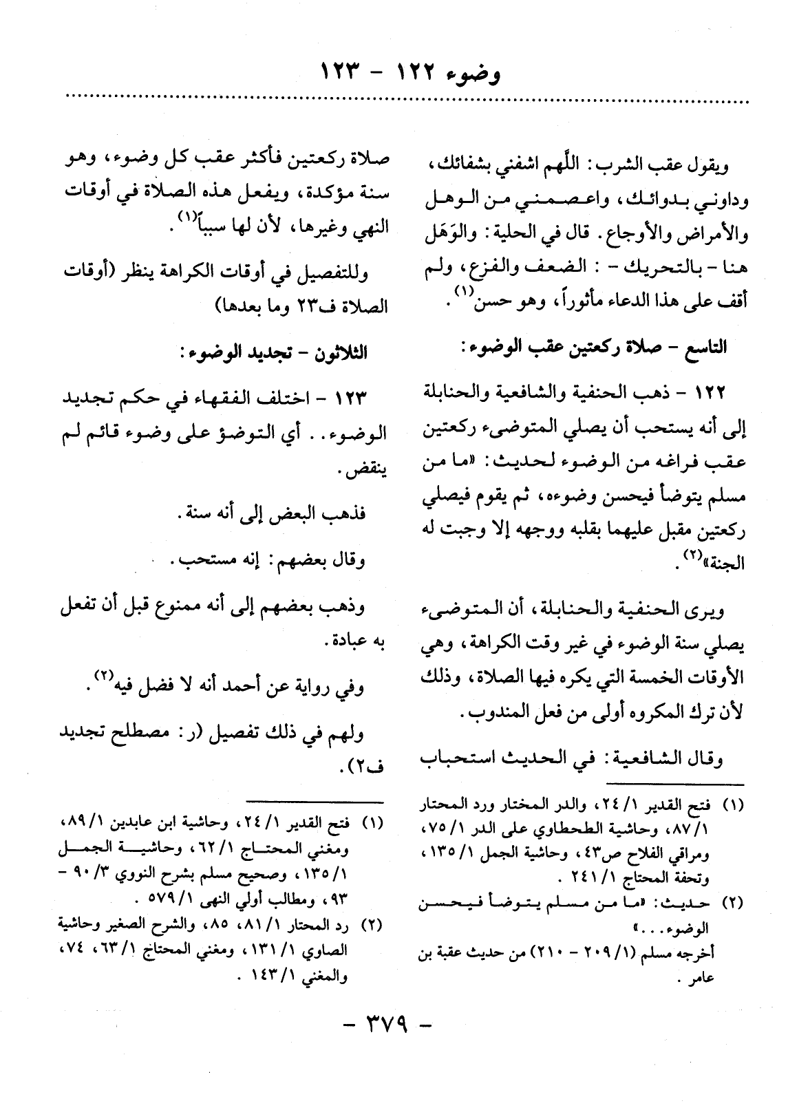 122 ـ ذَهَبَ الْحَنَفِيَّةُ وَالشَّافِعِيَّةُ وَالْحَنَابِلَةُ إِلَى أَنَّهُ يُسْتَحَبُّ أَنْ يُصَلِّيَ الْمُتَوَضِّئُ رَكْعَتَيْنِ عَقِبَ فَرَاغِهِ مِنَ الْوُضُوءِ؛ لِحَدِيثِ: مَا مِنْ أَحَدٍ يَتَوَضَّأُ فَيُحْسِنُ الْوُضُوءَ وَيُصَلِّي رَكْعَتَيْنِ يُقْبِل بِقَلْبِهِ وَوَجْهِهِ عَلَيْهِمَا إِلاَّ وَجَبَتْ لَهُ الْجَنَّةُ (2) .