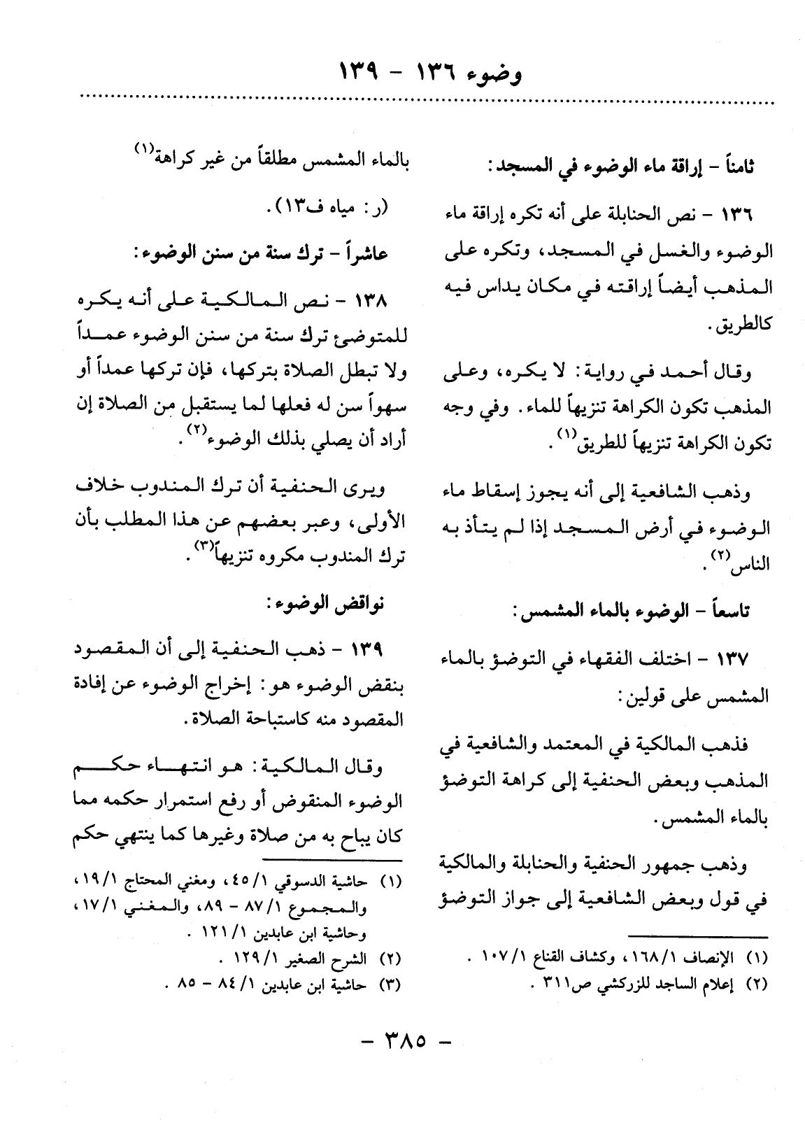 137 - اخْتَلَفَ الْفُقَهَاءُ فِي التَّوَضُّؤِ بِالْمَاءِ الْمُشَمَّسِ عَلَى قَوْلَيْنِ: