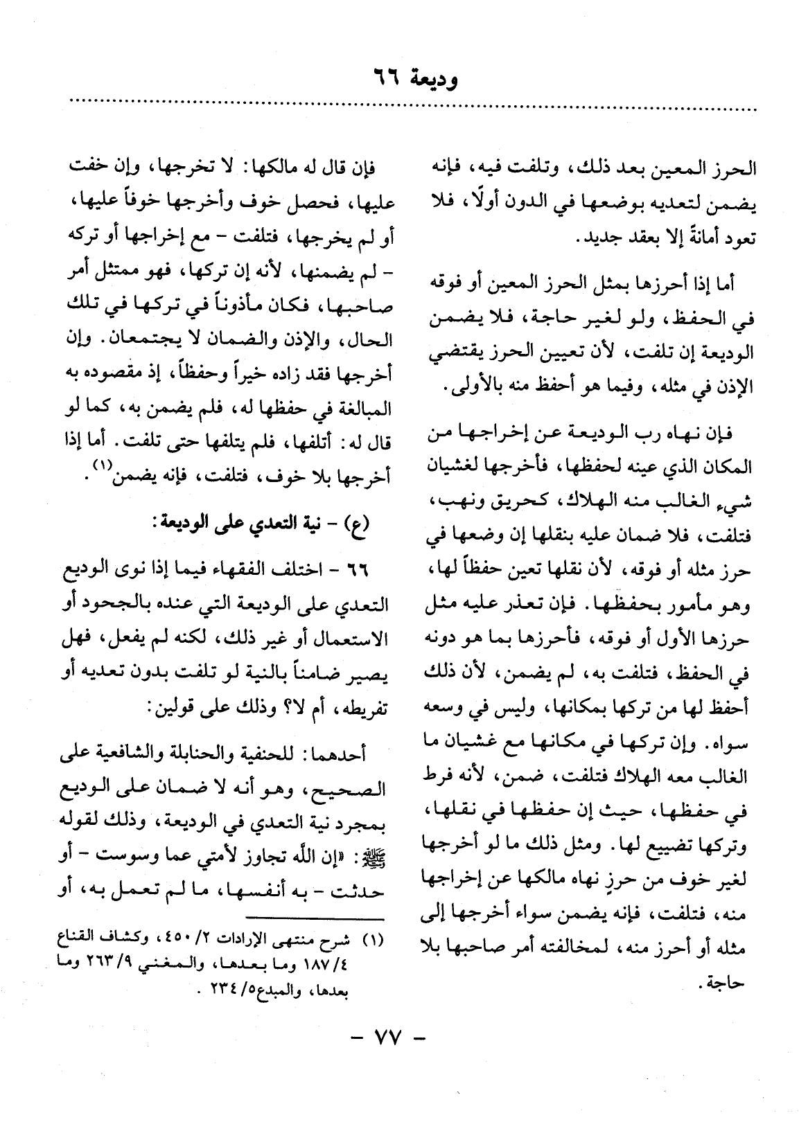 66 - اخْتَلَفَ الْفُقَهَاءُ فِيمَا إِذَا نَوَى الْوَدِيعُ التَّعَدِّيَ عَلَى الْوَدِيعَةِ الَّتِي عِنْدَهُ بِالْجُحُودِ أَوِ الاِسْتِعْمَال أَوْ غَيْرِ ذَلِكَ، لَكِنَّهُ لَمْ يَفْعَل، فَهَل يَصِيرُ ضَامِنًا بِالنِّيَّةِ لَوْ تَلِفَتْ بِدُونِ تَعَدِّيهِ أَوْ تَفْرِيطِهِ، أَمْ لاَ؟ وَذَلِكَ عَلَى قَوْلَيْنِ: