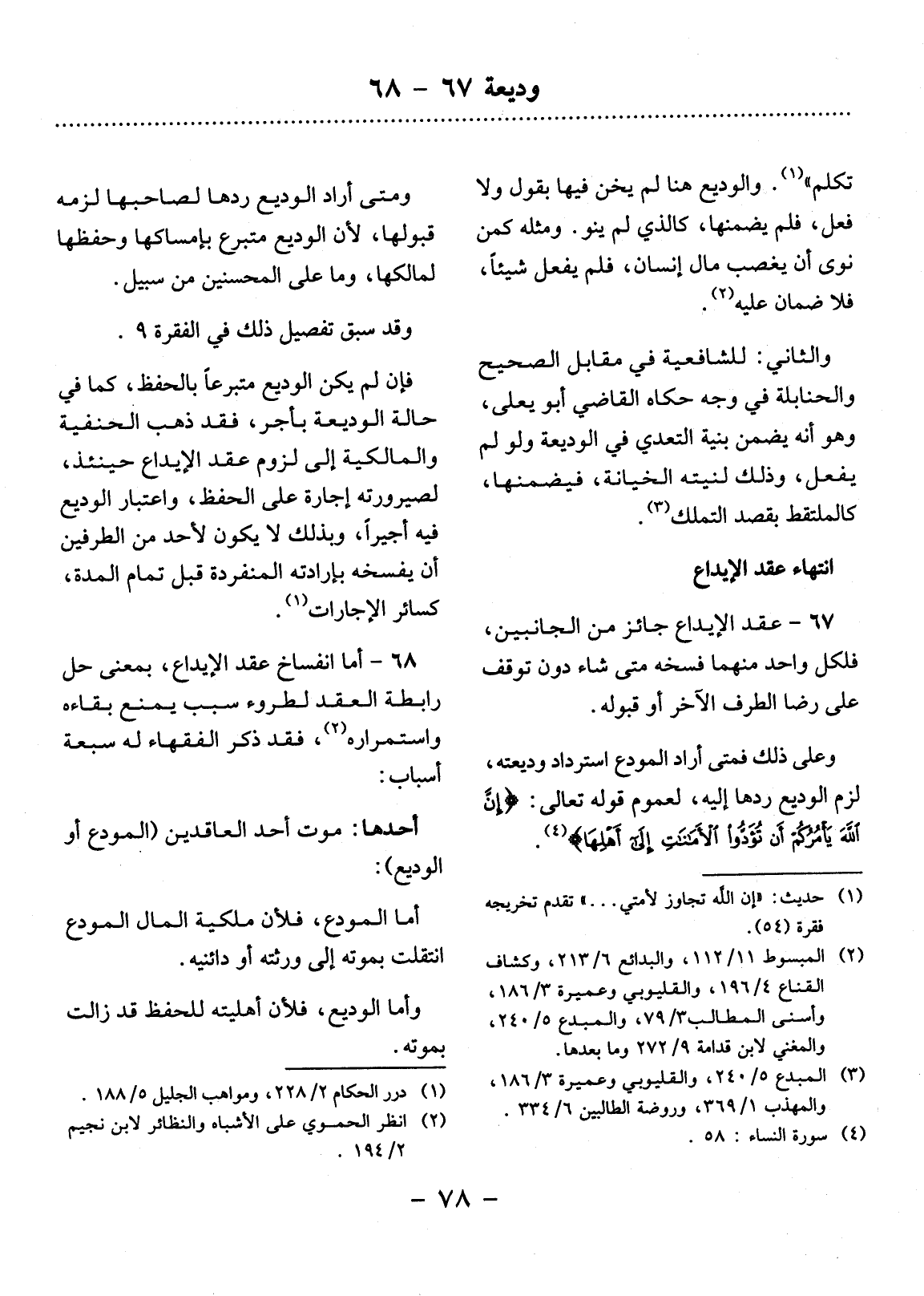 انْتِهَاءُ عَقْدِ الإِْيدَاعِ 67 - عَقْدُ الإِْيدَاعِ جَائِزٌ مِنَ الْجَانِبَيْنِ، فَلِكُل وَاحِدٍ مِنْهُمَا فَسْخُهُ مَتَى شَاءَ، دُونَ تَوَقُّفٍ عَلَى رِضَا الطَّرَفِ الآْخَرِ أَوْ قَبُولِهِ.