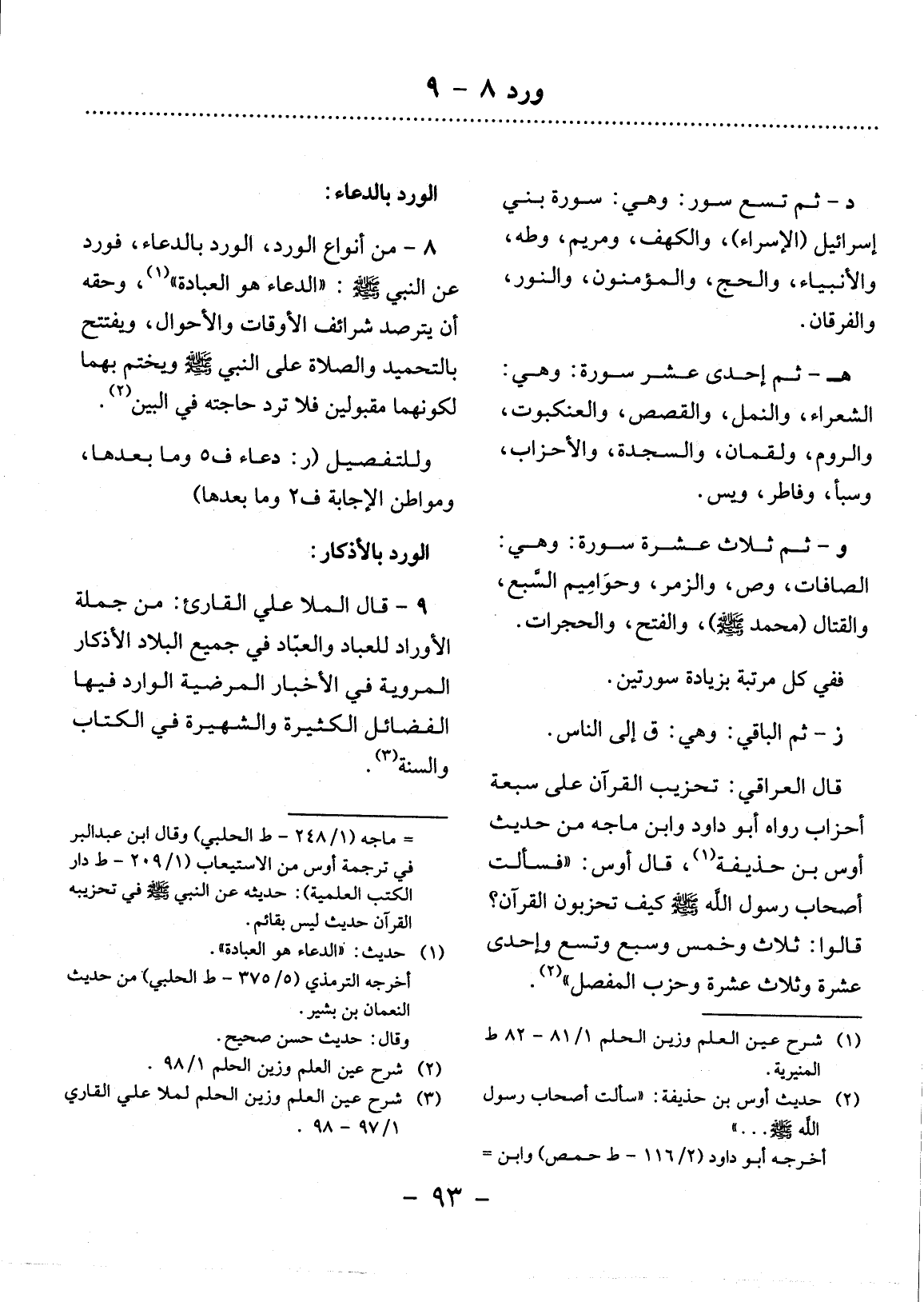 9 ـ قَال الْمُلاَّ عَلِيٌّ الْقَارِئُ: مِنْ جُمْلَةِ الأَْوْرَادِ لِلْعِبَادِ وَالْعُبَّادِ فِي جَمِيعِ الْبِلاَدِ الأَْذْكَارُ الْمَرْوِيَّةُ فِي الأَْخْبَارِ الْمَرْضِيَّةِ الْوَارِدِ فِيهَا الْفَضَائِل الْكَثِيرَةُ وَالشَّهِيرَةُ فِي الْكِتَابِ وَالسُّنَّةِ (3) .