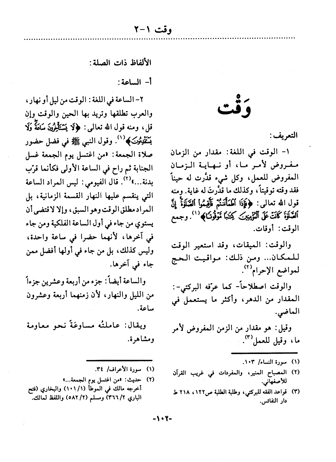 1 - الْوَقْتُ فِي اللُّغَةِ: مِقْدَارٌ مِنَ الزَّمَانِ مَفْرُوضٌ لأَِمْرٍ مَا، أَوْ نِهَايَةُ الزَّمَانِ الْمَفْرُوضِ لِلْعَمَل، وَكُل شَيْءٍ قَدَّرْتَ لَهُ حِينًا فَقَدْ وَقَّتَّهُ تَوْقِيتًا، وَكَذَلِكَ مَا قَدَّرْتَ لَهُ غَايَةً. وَمِنْهُ قَوْل اللَّهِ تَعَالَى: {فَإِذَا اطْمَأْنَنْتُمْ فَأَقِيمُوا الصَّلاَةَ إِنَّ الصَّلاَةَ كَانَتْ عَلَى الْمُؤْمِنِينَ كِتَابًا مَوْقُوتًا} (1) . وَجَمْعُ الْوَقْتِ: أَوْقَاتٌ.