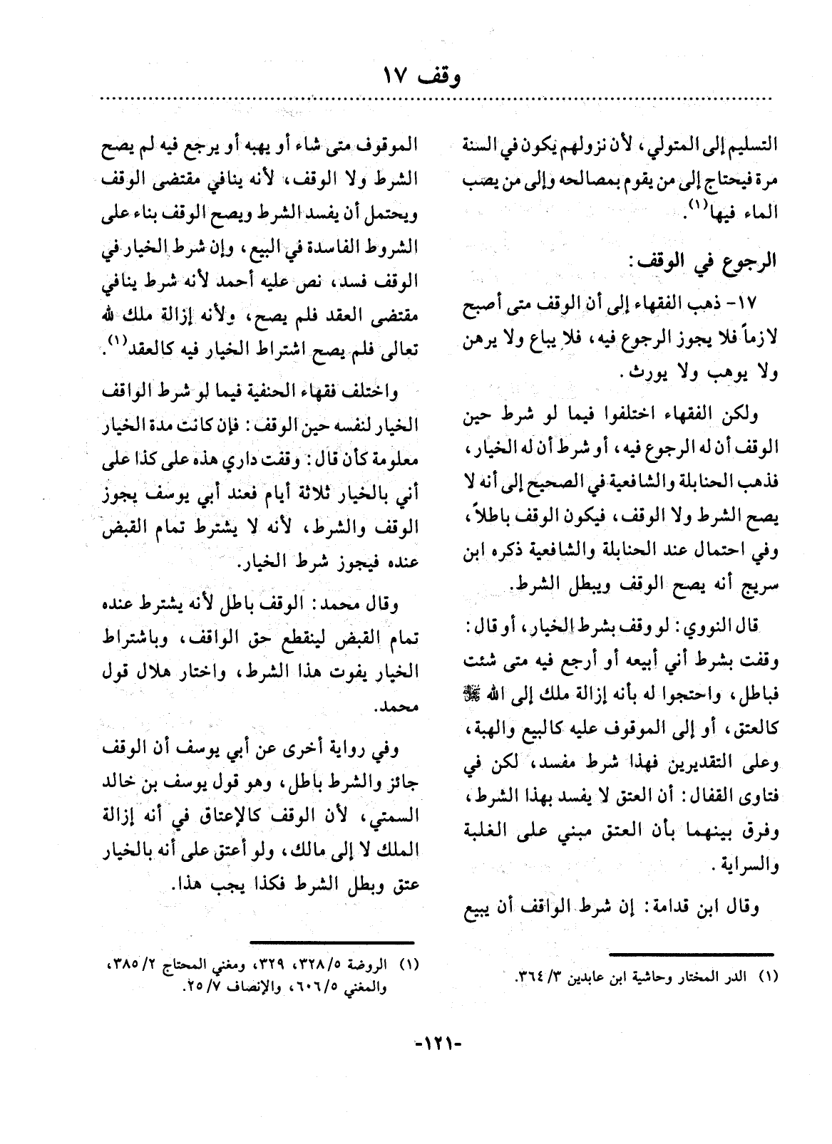 17 - ذَهَبَ الْفُقَهَاءُ إِلَى أَنَّ الْوَقْفَ مَتَى أَصْبَحَ لاَزِمًا فَلاَ يَجُوزُ الرُّجُوعُ فِيهِ، فَلاَ يُبَاعُ وَلاَ يُرْهَنُ وَلاَ يُوهَبُ وَلاَ يُورَثُ. وَلَكِنَّ الْفُقَهَاءَ اخْتَلَفُوا فِيمَا لَوْ شَرَطَ حِينَ الْوَقْفِ أَنَّ لَهُ الرُّجُوعَ فِيهِ، أَوْ شَرَطَ أَنْ لَهُ الْخِيَارَ، فَذَهَبَ الْحَنَابِلَةُ وَالشَّافِعِيَّةُ فِي الصَّحِيحِ إِلَى أَنَّهُ لاَ يَصِحُّ الشَّرْطُ وَلاَ الْوَقْفُ، فَيَكُونُ الْوَقْفُ بَاطِلاً، وَفِي احْتِمَالٍ عِنْدَ الْحَنَابِلَةِ وَالشَّافِعِيَّةِ ذَكَرَهُ ابْنُ سُرَيْجٍ أَنَّهُ يَصِحُّ الْوَقْفُ وَيَبْطُل الشَّرْطُ.