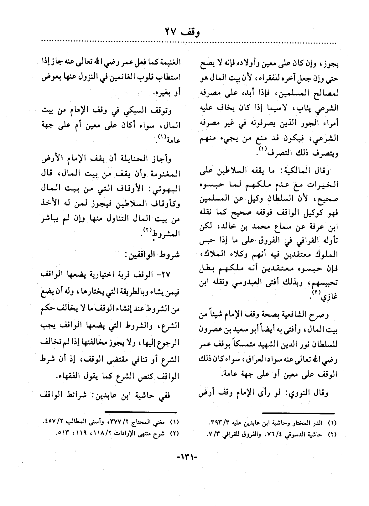 27 - الْوَقْفُ قُرْبَةٌ اخْتِيَارِيَّةٌ يَضَعُهَا الْوَاقِفُ فِيمَنْ يَشَاءُ وَبِالطَّرِيقَةِ الَّتِي يَخْتَارُهَا، وَلَهُ أَنْ يَضَعَ مِنَ الشُّرُوطِ عِنْدَ إِنْشَاءِ الْوَقْفِ مَا لاَ يُخَالِفُ حُكْمَ الشَّرْعِ، وَالشُّرُوطُ الَّتِي يَضَعُهَا الْوَاقِفُ يَجِبُ الرُّجُوعُ إِلَيْهَا، وَلاَ يَجُوزُ مُخَالَفَتُهَا إِذَا لَمْ تُخَالِفِ الشَّرْعَ أَوْ تُنَافِي مُقْتَضَى الْوَقْفِ؛ إِذْ إِنَّ شَرْطَ الْوَاقِفِ كَنَصِّ الشَّرْعِ كَمَا يَقُول الْفُقَهَاءُ.