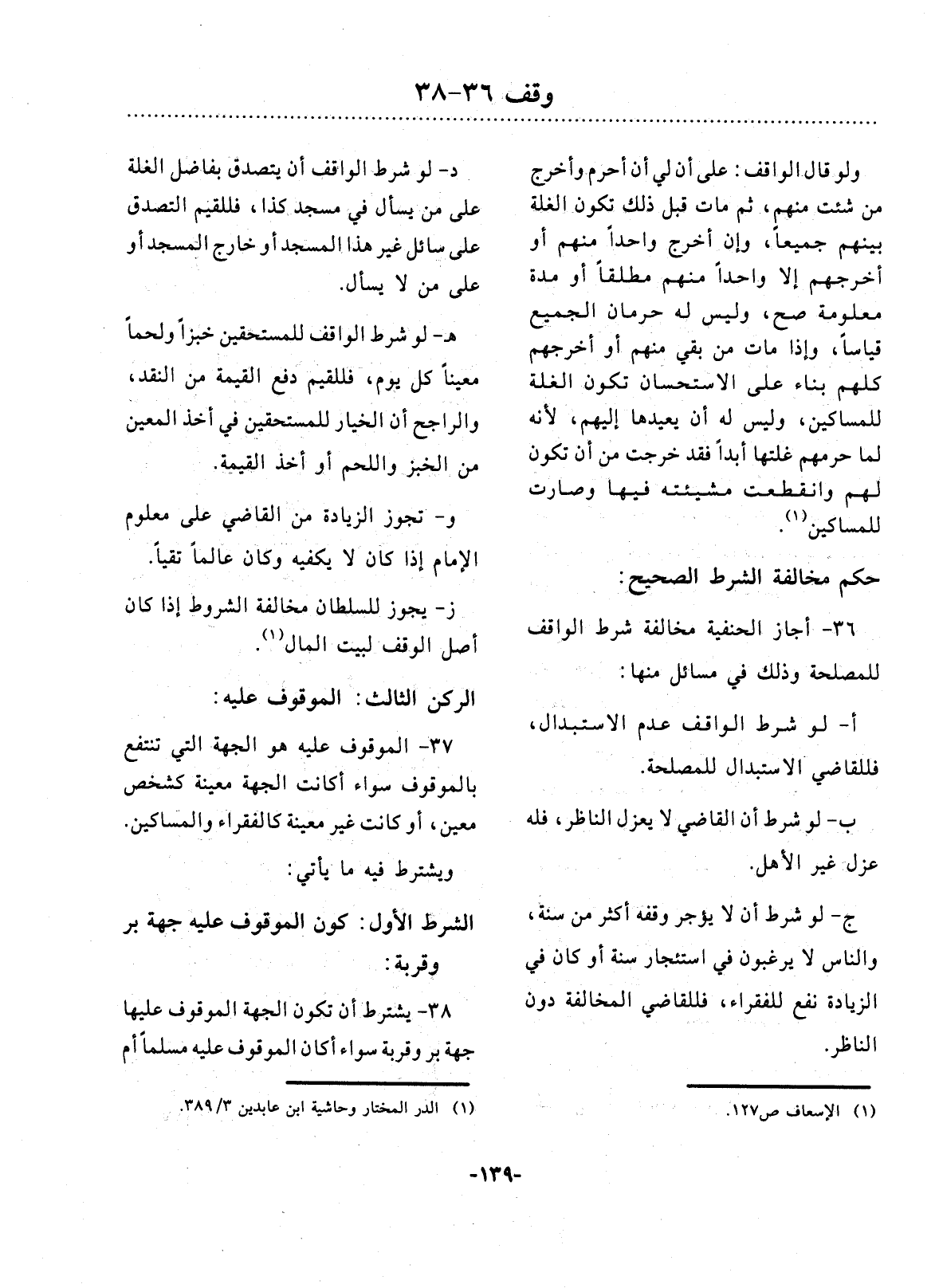 38 - يُشْتَرَطُ أَنْ تَكُونَ الْجِهَةُ الْمَوْقُوفُ عَلَيْهَا جِهَةَ بِرٍّ وَقُرْبَةٍ سَوَاءٌ أَكَانَ الْمَوْقُوفُ عَلَيْهِ مُسْلِمًا أَمْ