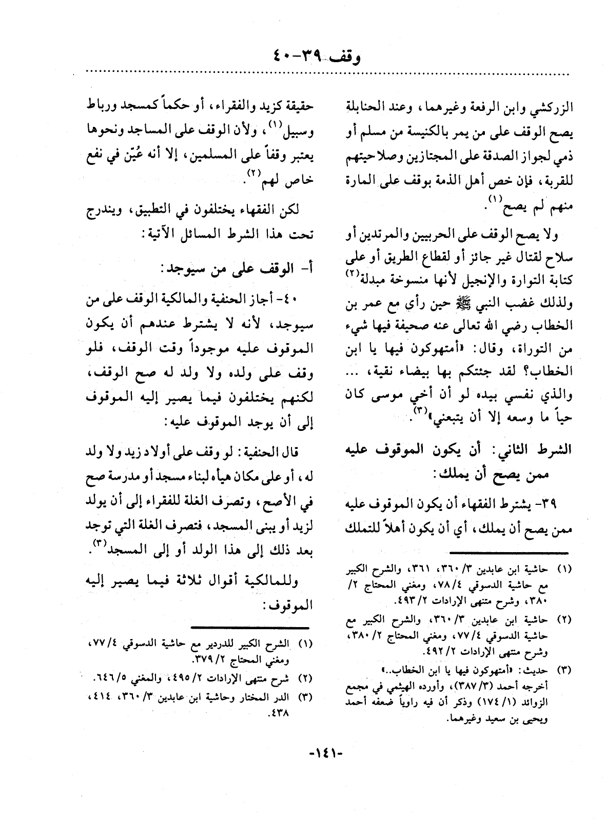 39 - يَشْتَرِطُ الْفُقَهَاءُ أَنْ يَكُونَ الْمَوْقُوفُ عَلَيْهِ مِمَّنْ يَصِحُّ أَنْ يَمْلِكَ، أَيْ أَنْ يَكُونَ أَهْلاً لِلتَّمَلُّكِ