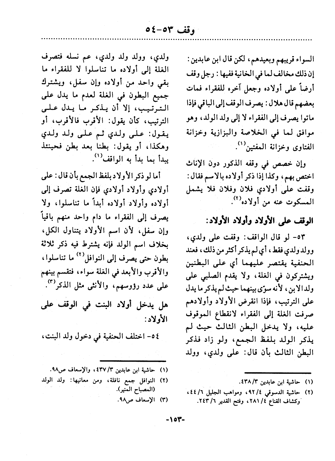 53 - لَوْ قَال الْوَاقِفُ: وَقَفْتُ عَلَى وَلَدِي، وَوَلَدِ وَلَدِي فَقَطْ، أَيْ لَمْ يَذْكُرْ أَكْثَرَ مِنْ ذَلِكَ، فَعِنْدَ الْحَنَفِيَّةِ يُقْتَصَرُ عَلَيْهِمَا أَيْ عَلَى الْبَطْنَيْنِ وَيَشْتَرِكُونَ فِي الْغَلَّةِ، وَلاَ يُقَدَّمُ الصُّلْبِيُّ عَلَى وَلَدِ الاِبْنِ، لأَِنَّهُ سَوَّى بَيْنَهُمَا حَيْثُ لَمْ يَذْكُرُ مَا يَدُل عَلَى التَّرْتِيبِ، فَإِذَا انْقَرَضَ الأَْوْلاَدُ وَأَوْلاَدُهُمْ صُرِفَتِ الْغَلَّةُ إِلَى الْفُقَرَاءِ لاِنْقِطَاعِ الْمَوْقُوفِ عَلَيْهِ، وَلاَ يَدْخُل الْبَطْنُ الثَّالِثُ حَيْثُ لَمْ يَذْكُرِ الْوَلَدَ بِلَفْظِ الْجَمْعِ، وَلَوْ زَادَ فَذَكَرَ الْبَطْنَ الثَّالِثَ بِأَنْ قَال: عَلَى وَلَدِي وَوَلَدِ