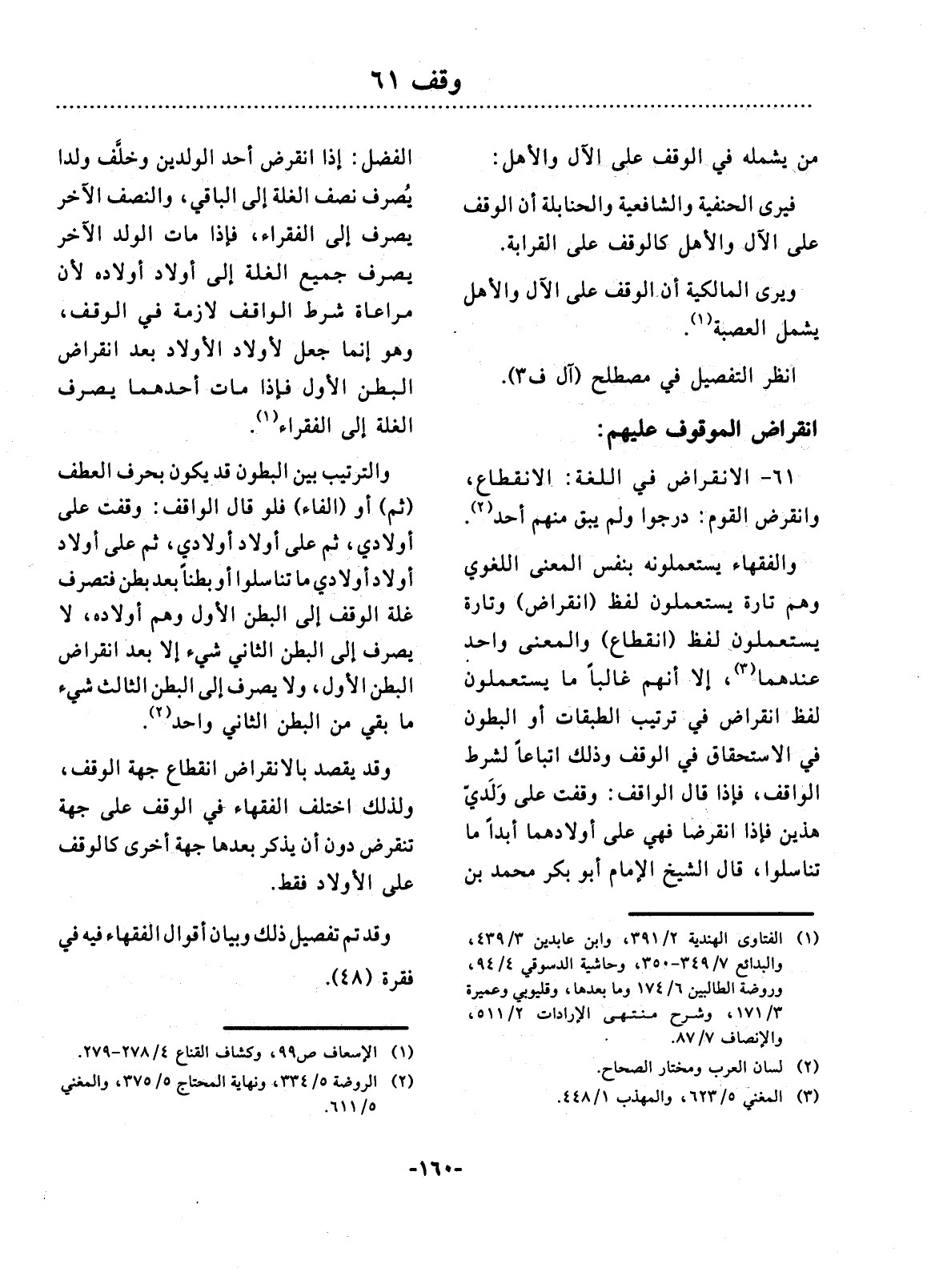 61 - الاِنْقِرَاضُ فِي اللُّغَةِ: الاِنْقِطَاعُ، وَانْقَرَضَ الْقَوْمُ: دَرَجُوا وَلَمْ يَبْقَ مِنْهُمْ أَحَدٌ (2) وَالْفُقَهَاءُ يَسْتَعْمِلُونَهُ بِنَفْسِ الْمَعْنَى اللُّغَوِيِّ وَهُمْ تَارَةً يَسْتَعْمِلُونَ لَفْظَ (انْقِرَاضٍ) وَتَارَةً يَسْتَعْمِلُونَ لَفْظَ (انْقِطَاعٍ) وَالْمَعْنَى وَاحِدٌ عِنْدَهُمَا (3) ، إِلاَّ أَنَّهُمْ غَالِبًا مَا يَسْتَعْمِلُونَ لَفْظَ انْقِرَاضٍ فِي تَرْتِيبِ الطَّبَقَاتِ أَوِ الْبُطُونِ فِي الاِسْتِحْقَاقِ فِي الْوَقْفِ وَذَلِكَ اتِّبَاعًا لِشَرْطِ الْوَاقِفِ، فَإِذَا قَال الْوَاقِفُ: وَقَفْتُ عَلَى وَلَدَيَّ هَذَيْنِ فَإِذَا انْقَرَضَا فَهِيَ عَلَى أَوْلاَدِهِمَا أَبَدًا مَا تَنَاسَلُوا، قَال الشَّيْخُ الإِْمَامُ أَبُو بَكْرٍ مُحَمَّدُ بْنُ