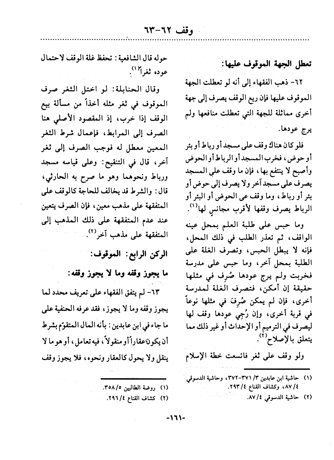 62 - ذَهَبَ الْفُقَهَاءُ إِلَى أَنَّهُ لَوْ تَعَطَّلَتِ الْجِهَةُ الْمَوْقُوفُ عَلَيْهَا فَإِنَّ رَيْعَ الْوَقْفِ يُصْرَفُ إِلَى جِهَةٍ أُخْرَى مُمَاثِلَةٍ لِلْجِهَةِ الَّتِي تَعَطَّلَتْ مَنَافِعُهَا وَلَمْ يُرْجَ عَوْدُهَا.