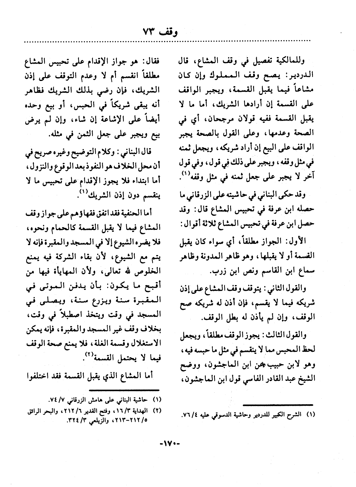 وَقَدْ حَكَى الْبُنَانِيُّ فِي حَاشِيَتِهِ عَلَى الزُّرْقَانِيِّ مَا حَصَّلَهُ ابْنُ عَرَفَةَ فِي تَحْبِيسِ الْمَشَاعِ قَال: وَقَدْ حَصَّل ابْنُ عَرَفَةَ فِي تَحْبِيسِ الْمَشَاعِ ثَلاَثَةَ أَقْوَالٍ: