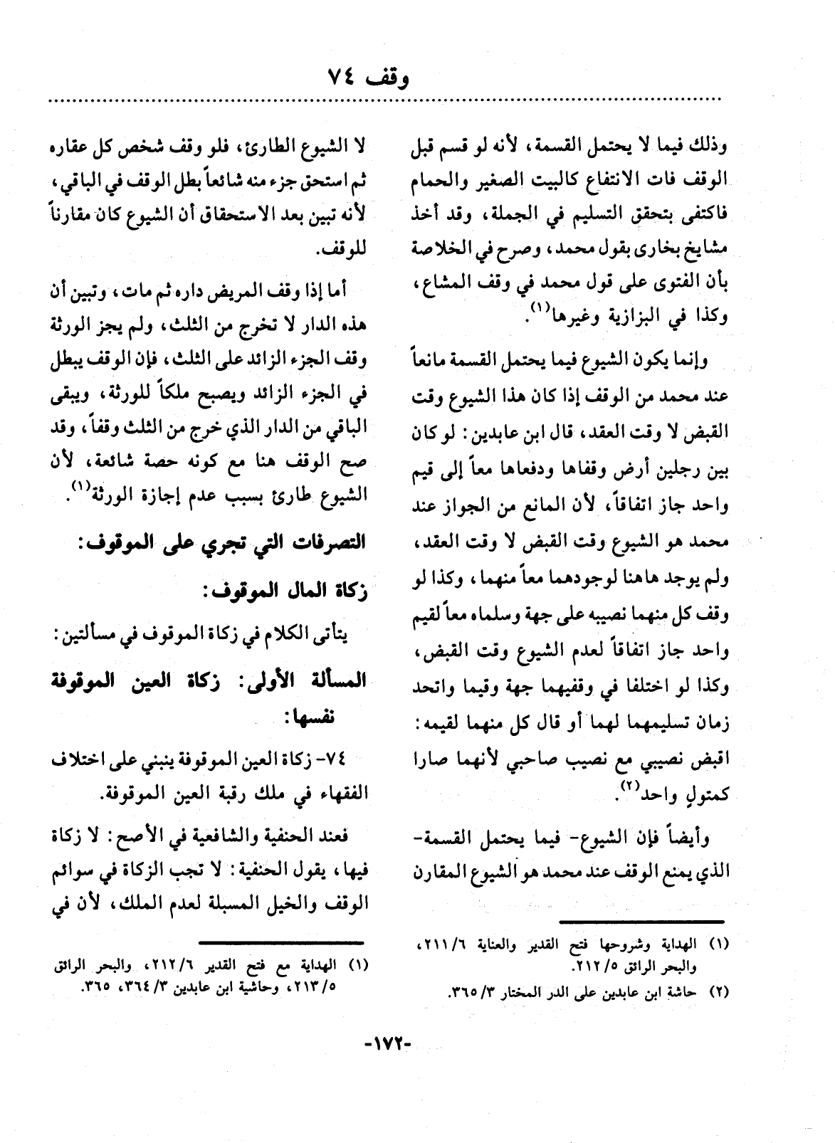 74 - زَكَاةُ الْعَيْنِ الْمَوْقُوفَةِ يَنْبَنِي عَلَى اخْتِلاَفِ الْفُقَهَاءِ فِي مِلْكِ رَقَبَةِ الْعَيْنِ الْمَوْقُوفَةِ.