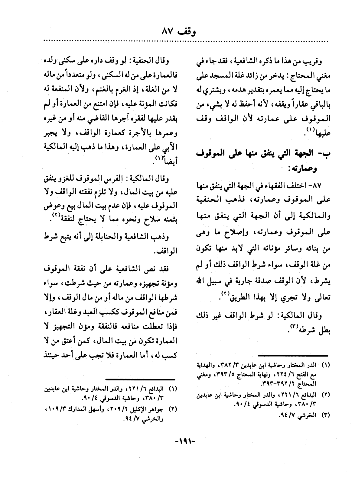 87 - اخْتَلَفَ الْفُقَهَاءُ فِي الْجِهَةِ الَّتِي يُنْفَقُ مِنْهَا عَلَى الْمَوْقُوفِ وَعِمَارَتِهِ، فَذَهَبَ الْحَنَفِيَّةُ وَالْمَالِكِيَّةُ إِلَى أَنَّ الْجِهَةَ الَّتِي يُنْفَقُ مِنْهَا عَلَى الْمَوْقُوفِ وَعِمَارَتِهِ، وَإِصْلاَحِ مَا وَهَى مِنْ بِنَائِهِ وَسَائِرِ مُؤْنَاتِهِ الَّتِي لاَ بُدَّ مِنْهَا تَكُونُ مِنْ غَلَّةِ الْوَقْفِ، سَوَاءٌ شَرَطَ الْوَاقِفُ ذَلِكَ أَوْ لَمْ يَشْرُطْ لأَِنَّ الْوَقْفَ صَدَقَةٌ جَارِيَةٌ فِي سَبِيل اللَّهِ تَعَالَى وَلاَ تَجْرِي إِلاَّ بِهَذَا الطَّرِيقِ (2) .