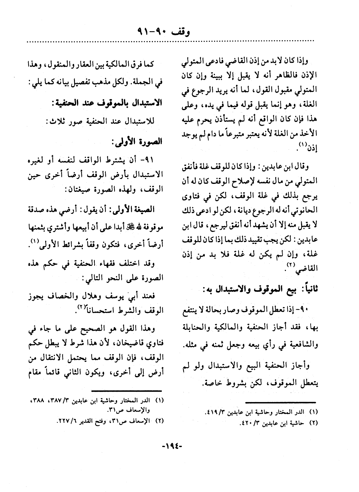 91 - أَنْ يَشْتَرِطَ الْوَاقِفُ لِنَفْسِهِ أَوْ لِغَيْرِهِ الاِسْتِبْدَال بِأَرْضِ الْوَقْفِ أَرْضًا أُخْرَى حِينَ الْوَقْفِ، وَلِهَذِهِ الصُّورَةِ صِيغَتَانِ: