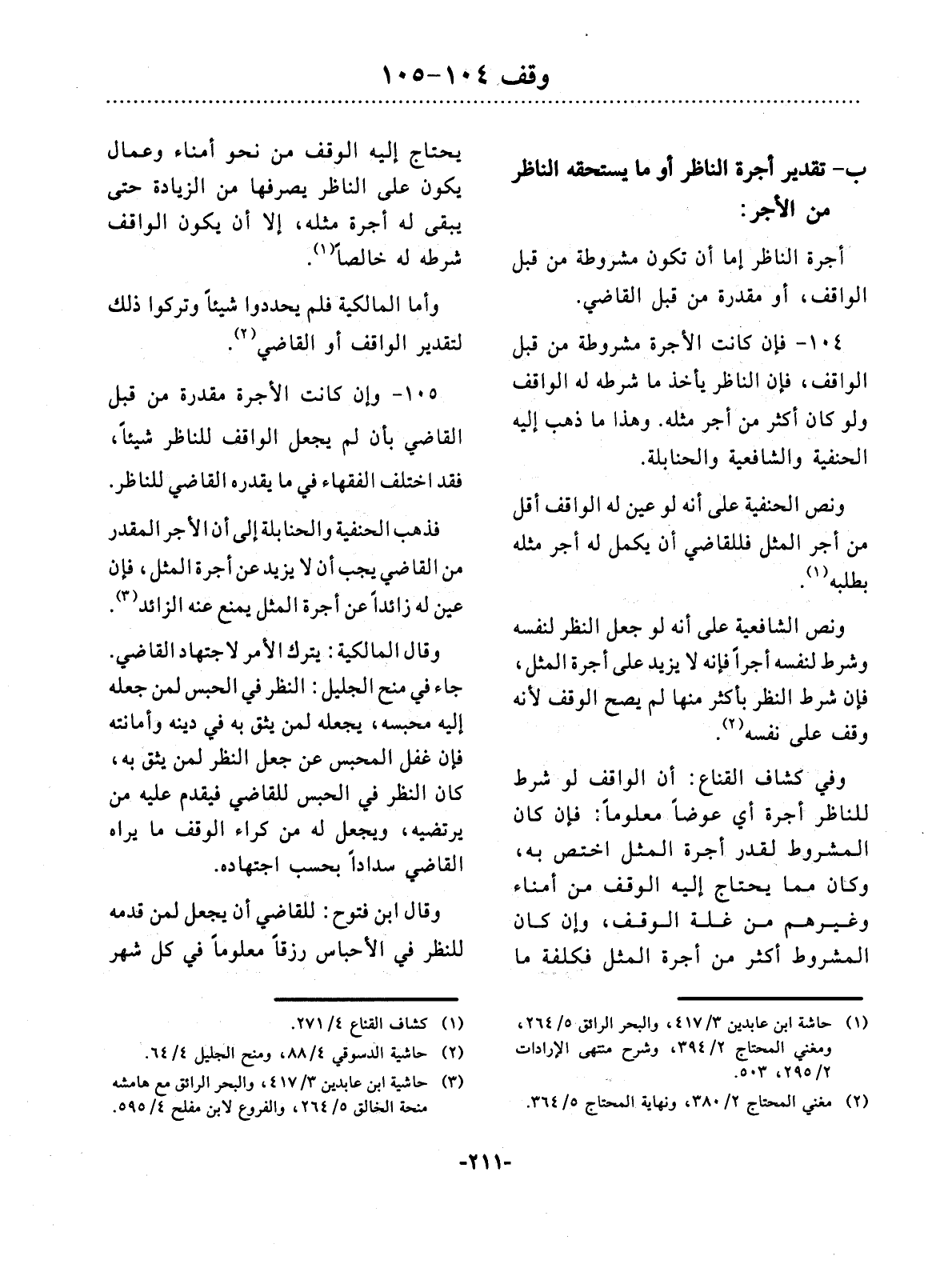 96 - أُجْرَةُ النَّاظِرِ إِمَّا أَنْ تَكُونَ مَشْرُوطَةً مِنْ قِبَل الْوَاقِفِ أَوْ مُقَدَّرَةً مِنْ قِبَل الْقَاضِي.
