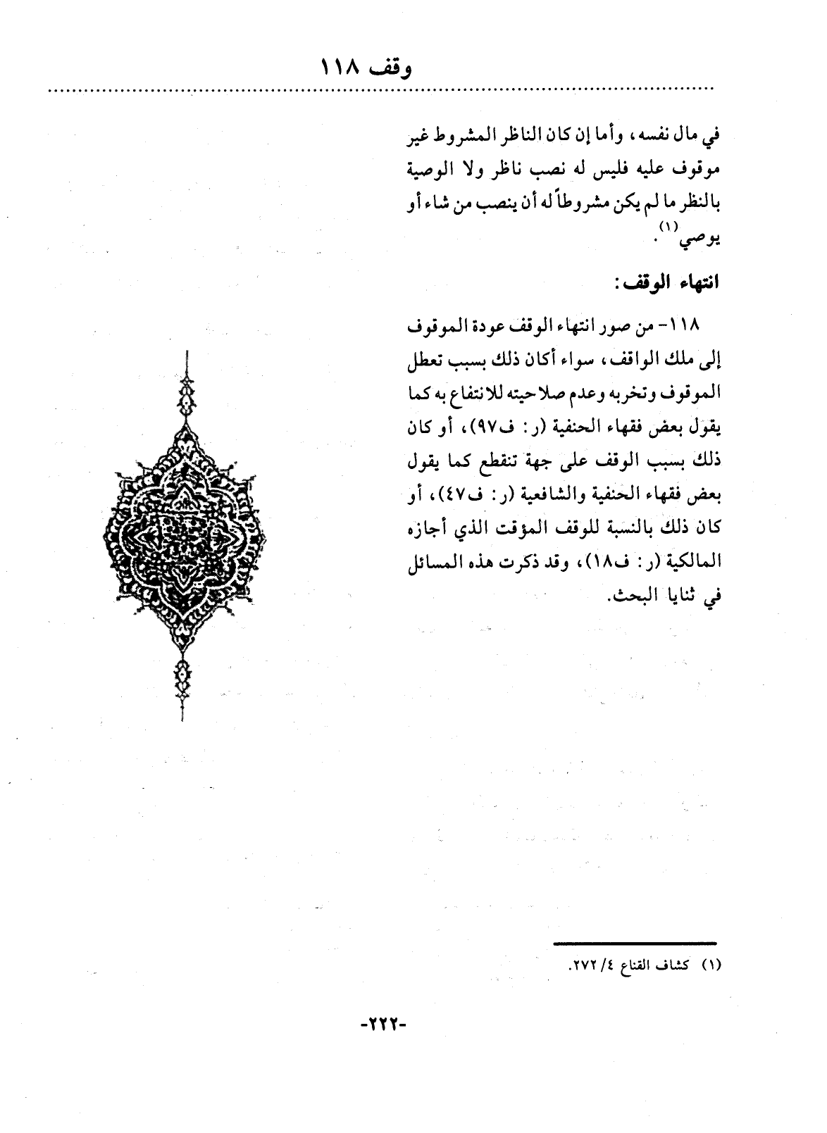 118 - مِنْ صُوَرِ انْتِهَاءِ الْوَقْفِ عَوْدَةُ الْمَوْقُوفِ إِلَى مِلْكِ الْوَاقِفِ، سَوَاءٌ أَكَانَ ذَلِكَ بِسَبَبِ تَعَطُّل الْمَوْقُوفِ وَتَخَرُّبِهِ وَعَدَمِ صَلاَحِيَتِهِ لِلاِنْتِفَاعِ بِهِ، كَمَا يَقُول بَعْضُ فُقَهَاءِ الْحَنَفِيَّةِ (ر: ف 97) ، أَوْ كَانَ ذَلِكَ بِسَبَبِ الْوَقْفِ عَلَى جِهَةٍ تَنْقَطِعُ، كَمَا يَقُول بَعْضُ فُقَهَاءِ الْحَنَفِيَّةِ وَالشَّافِعِيَّةِ (ر: ف47) ، أَوْ كَانَ ذَلِكَ بِالنِّسْبَةِ لِلْوَقْفِ الْمُؤَقَّتِ الَّذِي أَجَازَهُ الْمَالِكِيَّةُ (ر: ف 18) ، وَقَدْ ذَكَرْتُ هَذِهِ الْمَسَائِل فِي ثَنَايَا الْبَحْثِ.