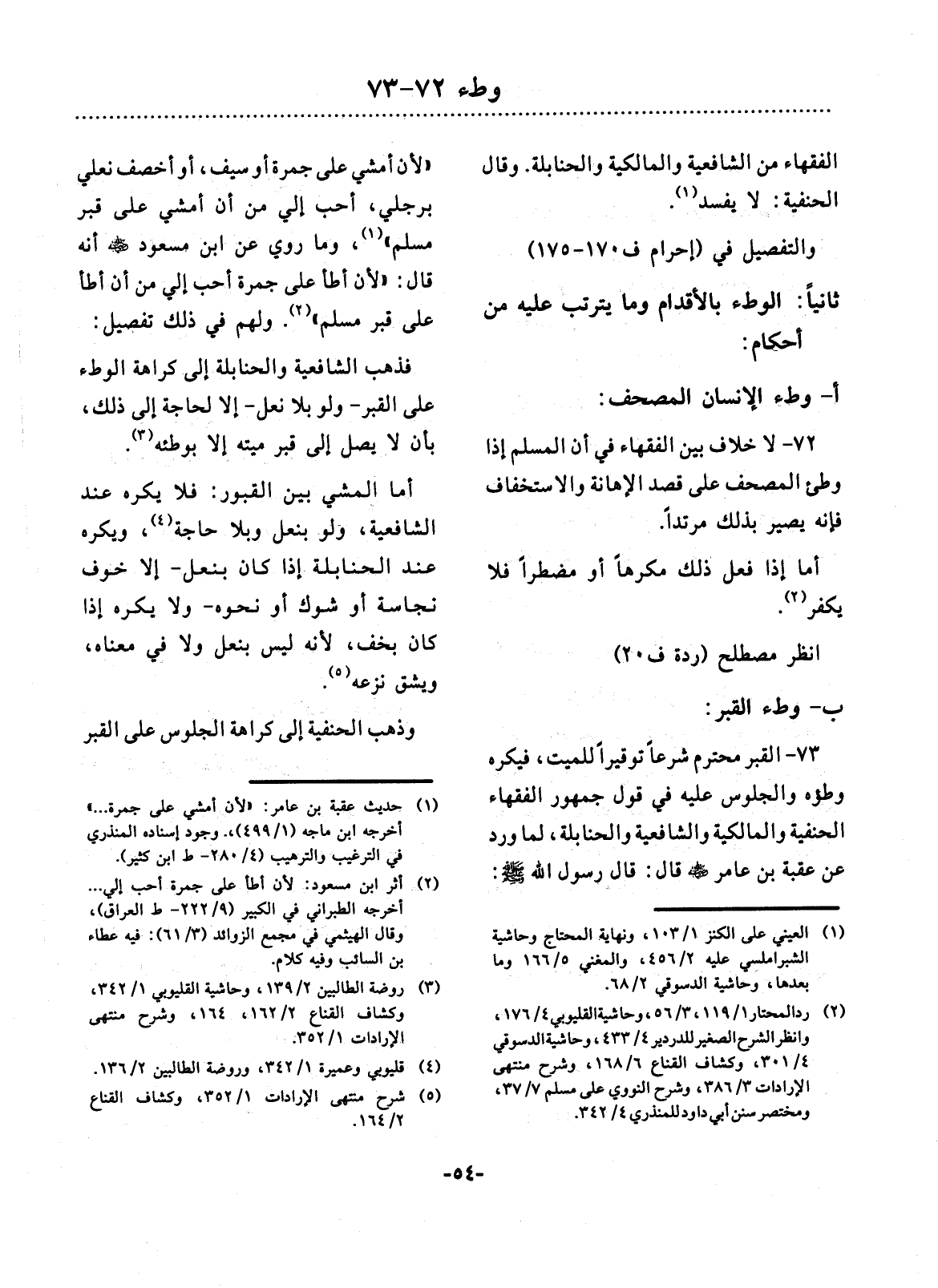 73 - الْقَبْرُ مُحْتَرَمٌ شَرْعًا تَوْقِيرًا لِلْمَيِّتِ، فَيُكْرَهُ وَطْؤُهُ وَالْجُلُوسُ عَلَيْهِ فِي قَوْل جُمْهُورِ الْفُقَهَاءِ، الْحَنَفِيَّةِ وَالْمَالِكِيَّةِ وَالشَّافِعِيَّةِ وَالْحَنَابِلَةِ، لِمَا وَرَدَ عَنْ عُقْبَةَ بْنِ عَامِرٍ رَضِيَ اللَّهُ عَنْهُ قَال: قَال رَسُول اللَّهِ صَلَّى اللَّهُ عَلَيْهِ وَسَلَّمَ: