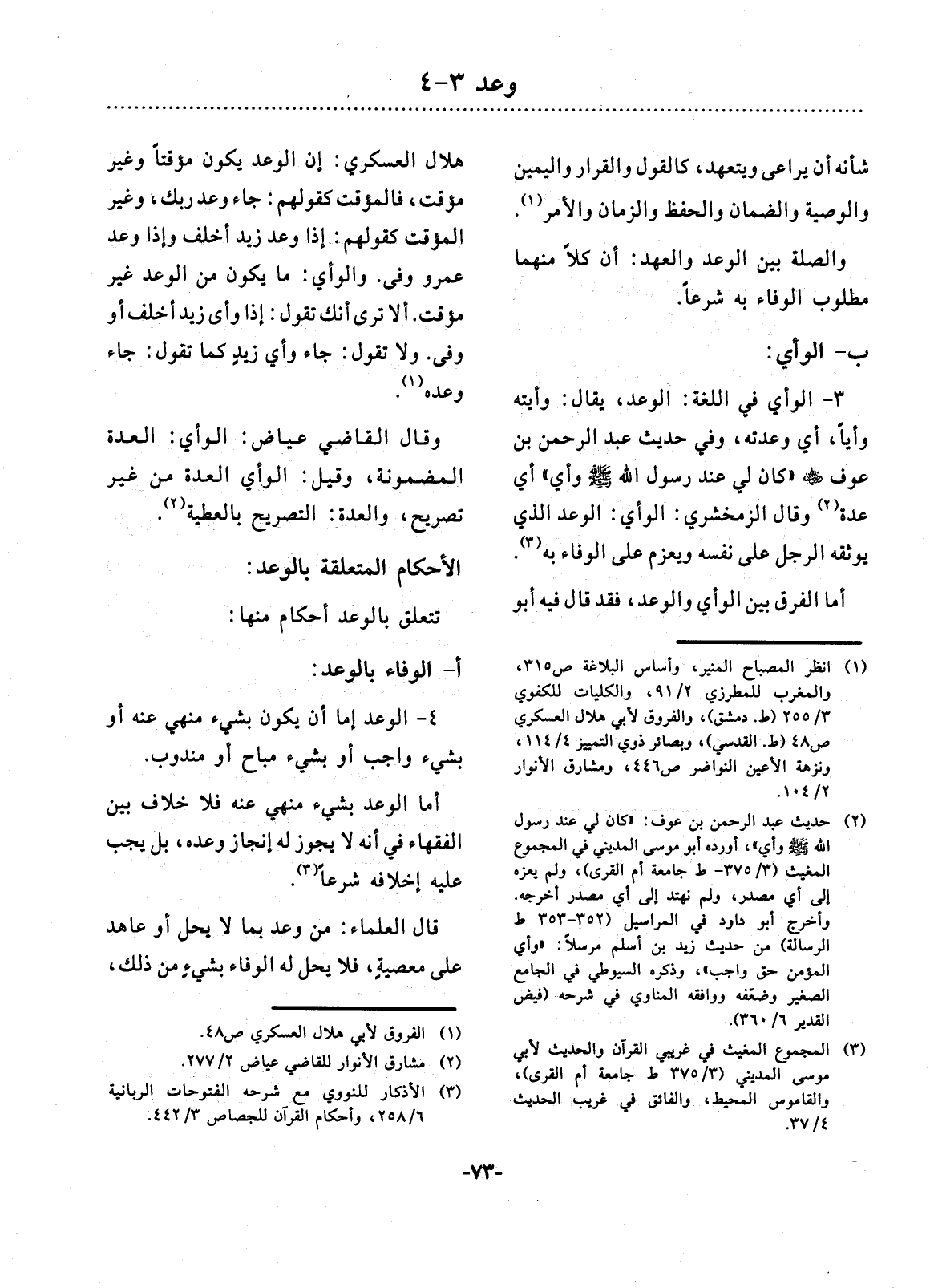 هِلاَلٍ الْعَسْكَرِيُّ: إِنَّ الْوَعْدَ يَكُونُ مُؤَقَّتًا وَغَيْرَ مُؤَقَّتٍ، فَالْمُؤَقَّتُ كَقَوْلِهِمْ: جَاءَ وَعْدُ رَبِّكَ، وَغَيْرُ الْمُؤَقَّتِ كَقَوْلِهِمْ: إِذَا وَعَدَ زَيْدٌ أَخْلَفَ وَإِذَا وَعَدَ عَمْرٌو وَفَّى. وَالْوَأْيُ: مَا يَكُونُ مِنَ الْوَعْدِ غَيْرَ مُؤَقَّتٍ، أَلاَ تَرَى أَنَّكَ تَقُول: إِذَا وَأَى زَيْدٌ أَخْلَفَ أَوْ وَفَّى. وَلاَ تَقُول: جَاءَ وَأْيُ زَيْدٍ، كَمَا تَقُول: جَاءَ وَعْدُهُ (1) .