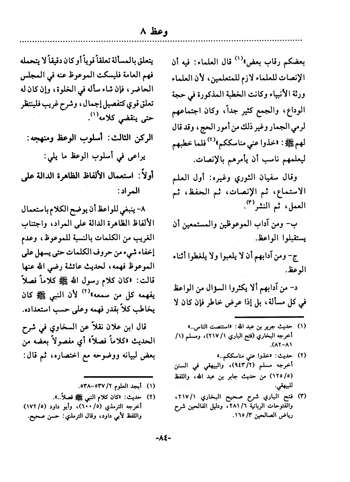 8 - يَنْبَغِي لِلْوَاعِظِ أَنْ يُوَضِّحَ الْكَلاَمَ بِاسْتِعْمَال الأَْلْفَاظِ الظَّاهِرَةِ الدَّالَّةِ عَلَى الْمُرَادِ، وَاجْتِنَابِ الْغَرِيبِ مِنَ الْكَلِمَاتِ بِالنِّسْبَةِ لِلْمَوْعُوظِ، وَعَدَمِ إِخْفَاءِ شَيْءٍ مِنْ حُرُوفِ الْكَلِمَاتِ حَتَّى يَسْهُل عَلَى الْمَوْعُوظِ فَهْمُهُ، لِحَدِيثِ عَائِشَةَ رَضِيَ اللَّهُ عَنْهَا قَالَتْ: كَانَ كَلاَمُ رَسُول اللَّهِ صَلَّى اللَّهُ عَلَيْهِ وَسَلَّمَ كَلاَمًا فَصْلاً يَفْهَمُهُ كُل مَنْ سَمِعَهُ (2) لأَِنَّ النَّبِيَّ صَلَّى اللَّهُ عَلَيْهِ وَسَلَّمَ كَانَ يُخَاطِبُ كُلًّا بِقَدْرِ فَهْمِهِ وَعَلَى حَسَبِ اسْتِعْدَادِهِ.