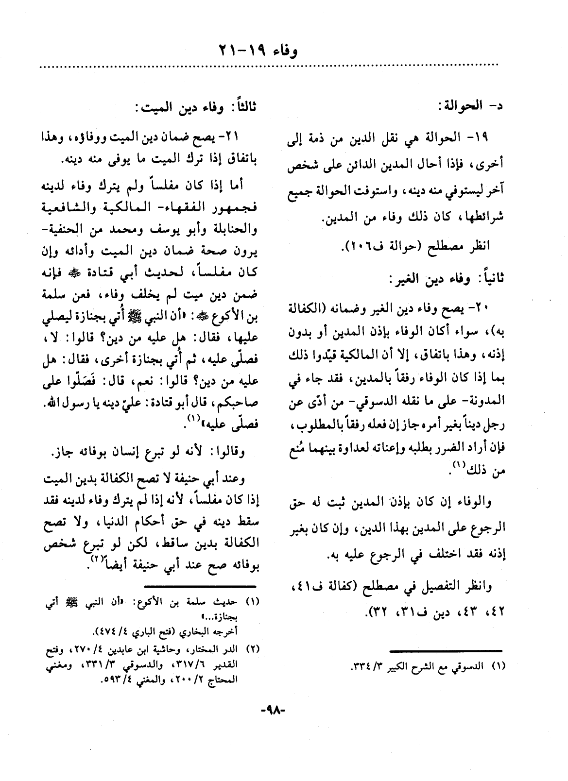19 - الْحَوَالَةُ هِيَ نَقْل الدَّيْنِ مِنْ ذِمَّةٍ إِلَى أُخْرَى، فَإِذَا أَحَال الْمَدِينُ الدَّائِنَ عَلَى شَخْصٍ آخَرَ لِيَسْتَوْفِيَ مِنْهُ دَيْنَهُ، وَاسْتَوْفَتِ الْحَوَالَةُ جَمِيعَ شَرَائِطِهَا، كَانَ ذَلِكَ وَفَاءً مِنَ الْمَدِينِ.