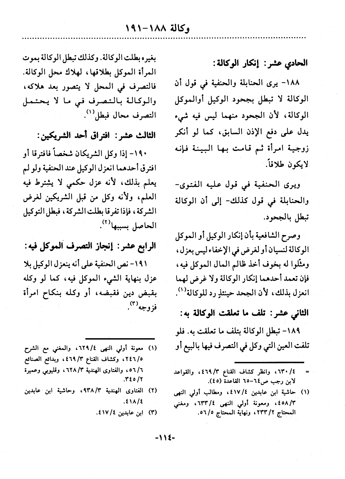 189 - تَبْطُل الْوَكَالَةُ بِتَلَفِ مَا تَعَلَّقَتْ بِهِ. فَلَوْ تَلِفَتِ الْعَيْنُ الَّتِي وُكِّل فِي التَّصَرُّفِ فِيهَا بِالْبَيْعِ أَوِ