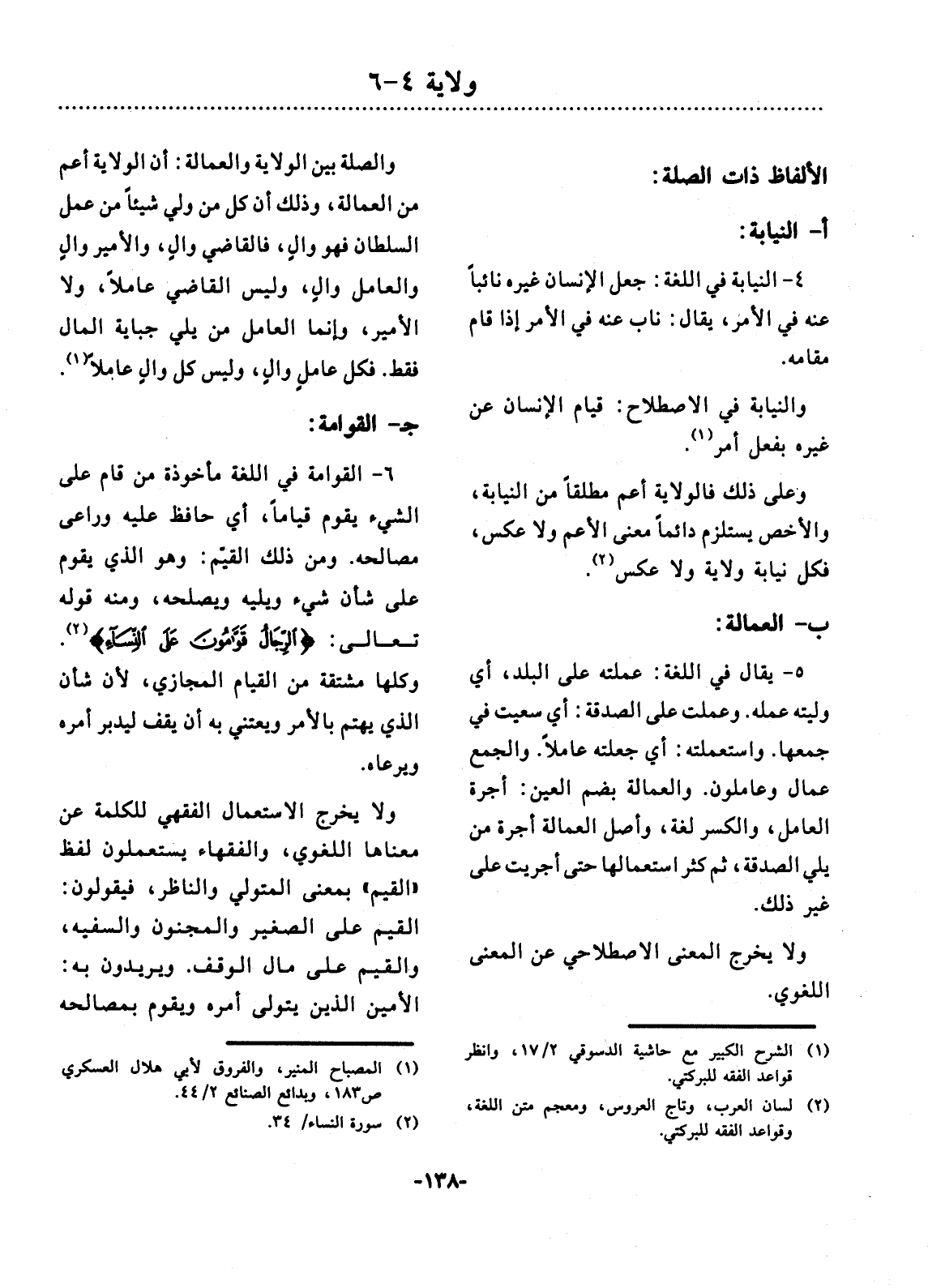 6 ـ الْقِوَامَةُ فِي اللُّغَةِ مَأْخُوذَةٌ مَنْ قَامَ عَلَى الشَّيْءِ يَقُومُ قِيَامًا، أَيْ حَافَظَ عَلَيْهِ وَرَاعَى مَصَالِحَهُ. وَمِنْ ذَلِكَ: الْقَيِّمُ، وَهُوَ الَّذِي يَقُومُ عَلَى شَأْنِ شَيْءٍ وَيَلِيهِ وَيُصْلِحُهُ، وَمِنْهُ قَوْلُهُ تَعَالَى: ( {الرِّجَال قَوَّامُونَ عَلَى النِّسَاءِ} . (2) وَكُلُّهَا مُشْتَقَّةٌ مِنَ الْقِيَامِ الْمَجَازِيِّ، لأَِنَّ شَأْنَ الَّذِي يَهْتَمُّ بِالأَْمْرِ وَيَعْتَنِي بِهِ أَنْ يَقِفَ لِيُدَبِّرَ أَمْرَهُ وَيَرْعَاهُ.
