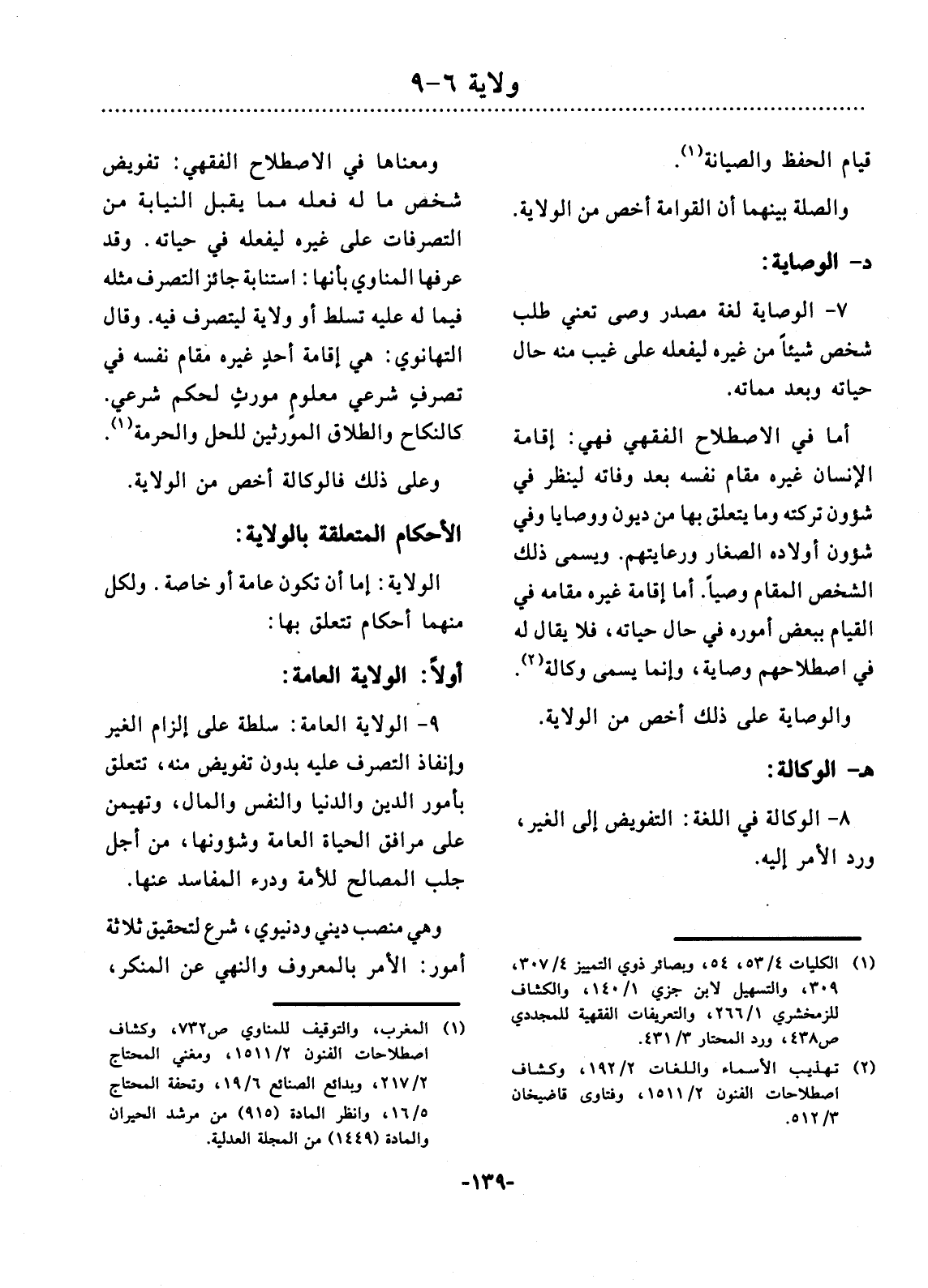9 ـ الْوِلاَيَةُ الْعَامَّةُ: سُلْطَةٌ عَلَى إِلْزَامِ الْغَيْرِ وَإِنْفَاذِ التَّصَرُّفِ عَلَيْهِ بِدُونِ تَفْوِيضٍ مِنْهُ، تَتَعَلَّقُ بِأُمُورِ الدِّينِ وَالدُّنْيَا وَالنَّفْسِ وَالْمَالِ، وَتُهَيْمِنُ عَلَى مَرَافِقِ الْحَيَاةِ الْعَامَّةِ وَشُؤُونِهَا، مِنْ أَجْل جَلْبِ الْمَصَالِحِ لِلأُْمَّةِ وَدَرْءِ الْمَفَاسِدِ عَنْهَا.