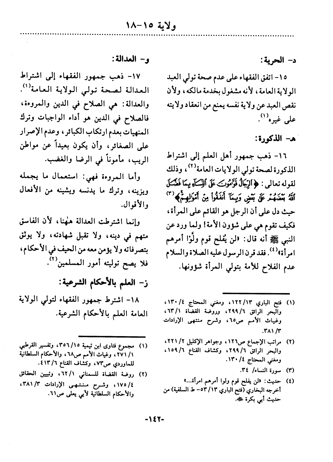 18 - اشْتَرَطَ جُمْهُورُ الْفُقَهَاءِ لِتَوَلِّي الْوِلاَيَةِ الْعَامَّةِ الْعِلْمَ بِالأَْحْكَامِ الشَّرْعِيَّةِ.