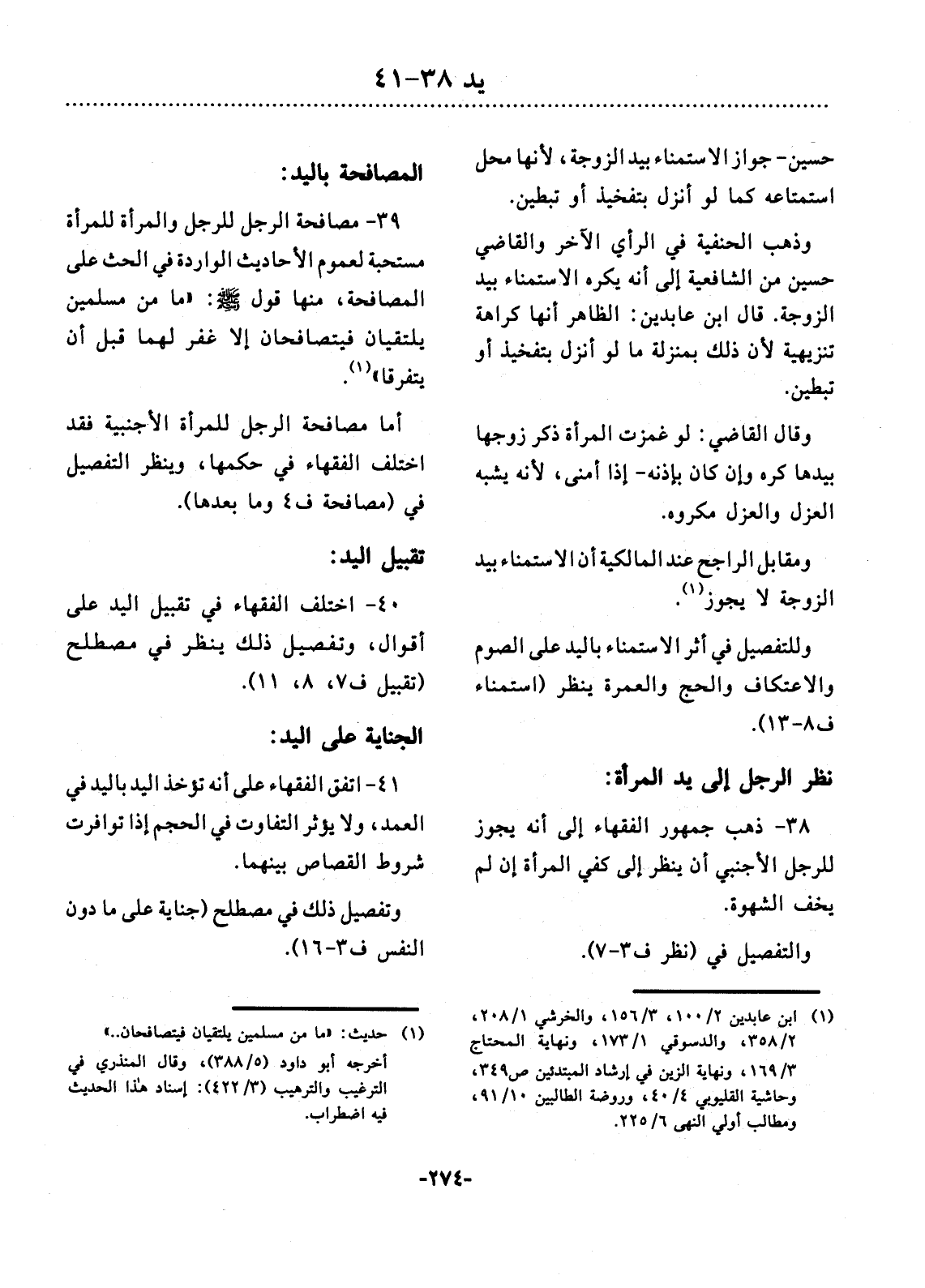 38 - ذَهَبَ جُمْهُورُ الْفُقَهَاءِ إِلَى أَنَّهُ يَجُوزُ لِلرَّجُل الأَْجْنَبِيِّ أَنْ يَنْظُرَ إِلَى كَفَّيِ الْمَرْأَةِ إِنْ لَمْ يَخَفِ الشَّهْوَةَ.