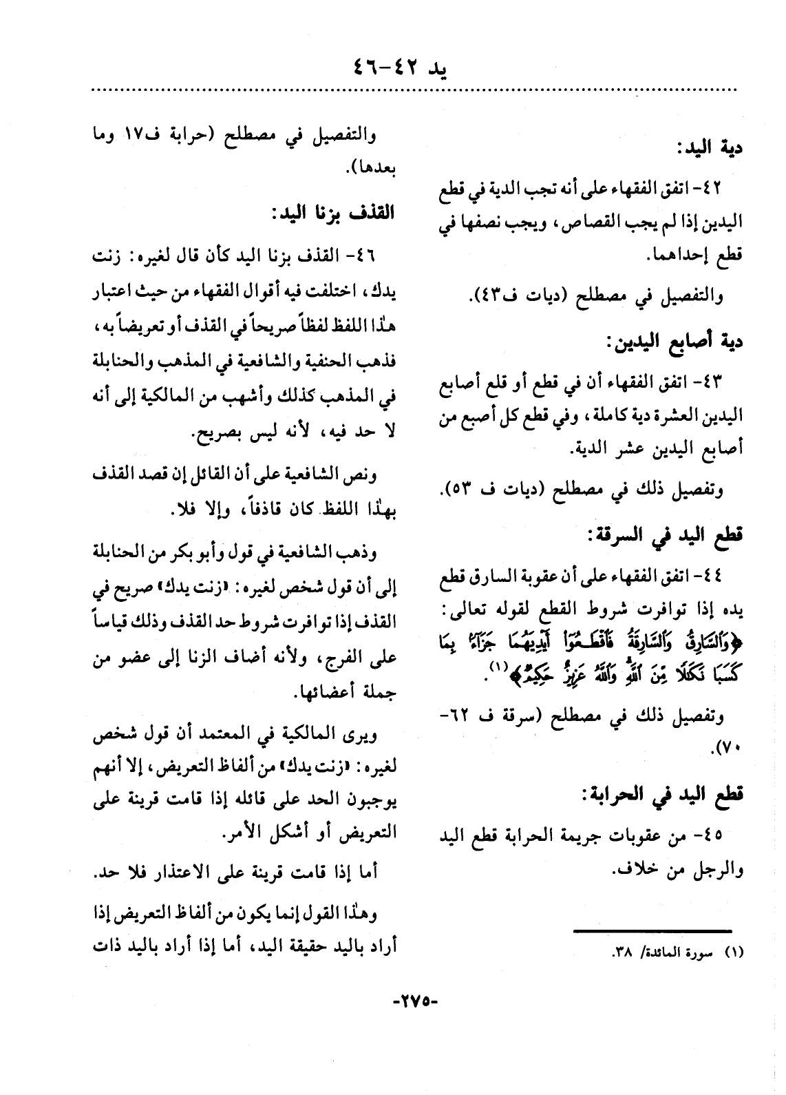 44 - اتَّفَقَ الْفُقَهَاءُ عَلَى أَنَّ عُقُوبَةَ السَّارِقِ قَطْعُ يَدِهِ إِذَا تَوَافَرَتْ شُرُوطُ الْقَطْعِ لِقَوْلِهِ تَعَالَى: {وَالسَّارِقُ وَالسَّارِقَةُ فَاقْطَعُوا أَيْدِيَهُمَا جَزَاءً بِمَا كَسَبَا نَكَالاً مِنَ اللَّهِ وَاللَّهُ عَزِيزٌ حَكِيمٌ (1) } .