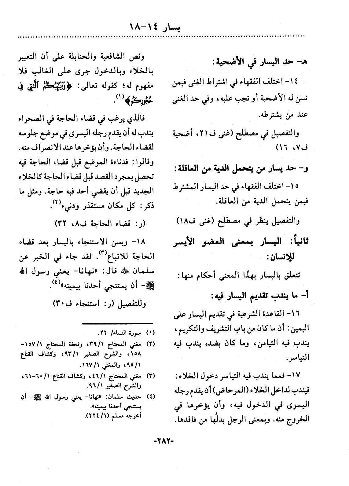 16 - الْقَاعِدَةُ الشَّرْعِيَّةُ فِي تَقْدِيمِ الْيَسَارِ عَلَى الْيَمِينِ: أَنَّ مَا كَانَ مِنْ بَابِ التَّشْرِيفِ وَالتَّكْرِيمِ يُنْدَبُ فِيهِ التَّيَامُنُ، وَمَا كَانَ بِضِدِّهِ يُنْدَبُ فِيهِ التَّيَاسُرُ.