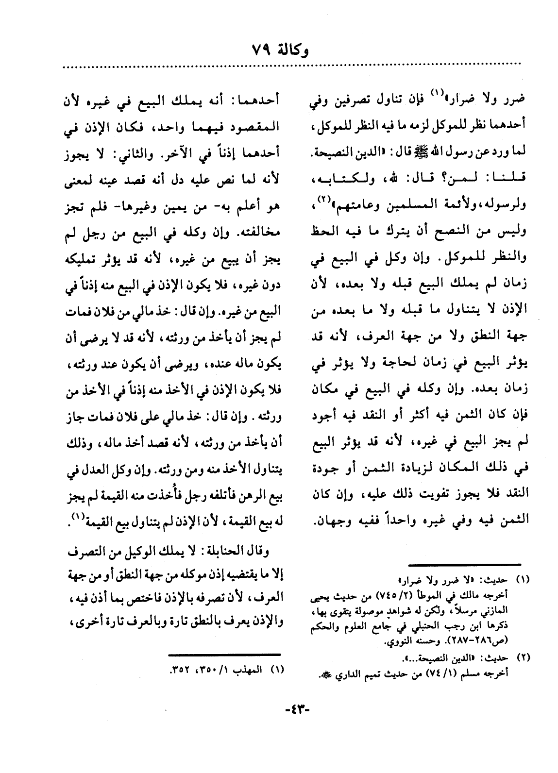 ضَرَرَ وَلاَ ضِرَارَ، فَإِنْ تَنَاوَل تَصَرُّفَيْنِ وَفِي أَحَدِهِمَا نَظَرٌ لِلْمُوَكِّل لَزِمَهُ مَا فِيهِ النَّظَرُ لِلْمُوَكِّل، لِمَا وَرَدَ عَنْ رَسُول اللَّهِ صَلَّى اللَّهُ عَلَيْهِ وَسَلَّمَ: الدِّينُ النَّصِيحَةُ. قُلْنَا: لِمَنْ؟ قَال: لِلَّهِ وَلِكِتَابِهِ وَلِرَسُولِهِ وَلأَِئِمَّةِ الْمُسْلِمِينَ وَعَامَّتِهِمْ وَلَيْسَ مِنَ النُّصْحِ أَنْ يَتْرُكَ مَا فِيهِ الْحَظُّ وَالنَّظَرُ لِلْمُوَكِّل. وَإِنْ وَكَّل فِي الْبَيْعِ فِي زَمَانٍ لَمْ يَمْلِكِ الْبَيْعَ قَبْلَهُ وَلاَ بَعْدَهُ لأَِنَّ الإِْذْنَ لاَ يَتَنَاوَل مَا قَبْلَهُ وَلاَ مَا بَعْدَهُ مِنْ جِهَةِ النُّطْقِ وَلاَ مِنْ جِهَةِ الْعُرْفِ لأَِنَّهُ قَدْ يُؤْثِرُ الْبَيْعَ فِي زَمَانٍ لِحَاجَةٍ وَلاَ يُؤْثِرُ فِي زَمَانٍ بَعْدَهُ. وَإِنْ وَكَّلَهُ فِي الْبَيْعِ فِي مَكَانٍ، فَإِنْ كَانَ الثَّمَنُ فِيهِ أَكْثَرَ أَوِ النَّقْدُ فِيهِ أَجْوَدَ لَمْ يَجُزِ الْبَيْعُ فِي غَيْرِهِ لأَِنَّهُ قَدْ يُؤْثِرُ الْبَيْعَ فِي ذَلِكَ الْمَكَانِ لِزِيَادَةِ الثَّمَنِ أَوْ جَوْدَةِ النَّقْدِ فَلاَ يَجُوزُ تَفْوِيتُ ذَلِكَ عَلَيْهِ، وَإِنْ كَانَ الثَّمَنُ فِيهِ وَفِي غَيْرِهِ وَاحِدًا فَفِيهِ وَجْهَانِ: