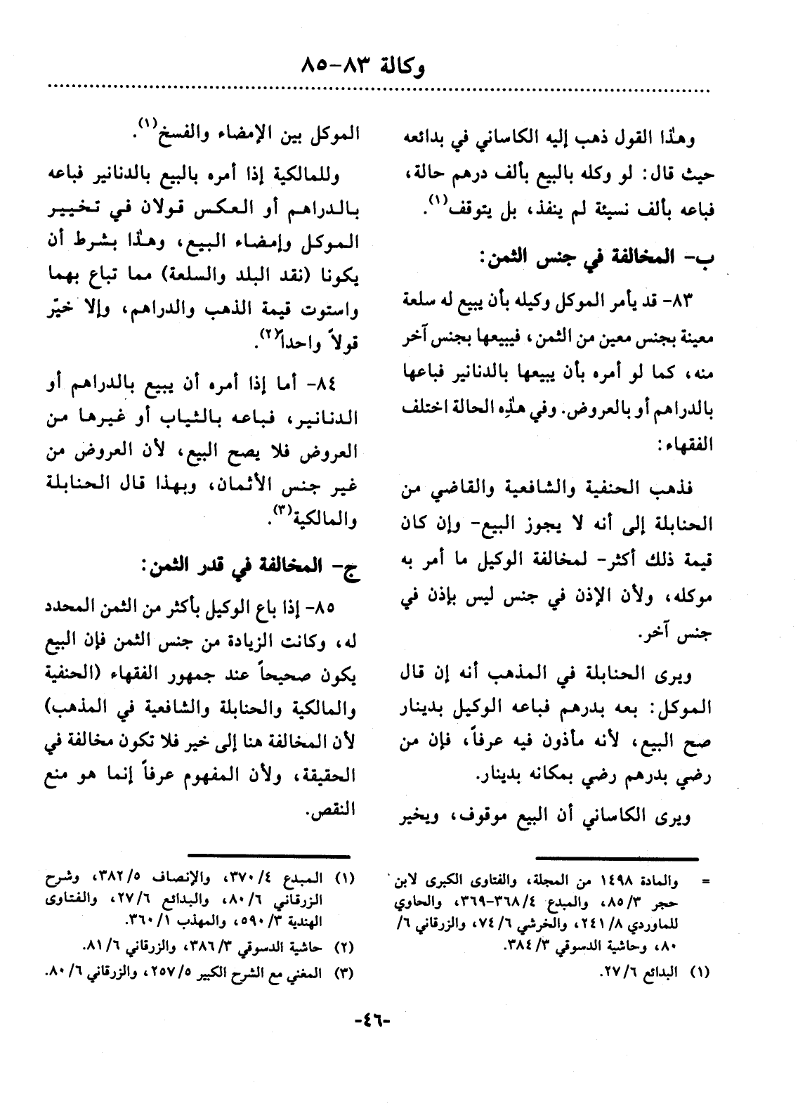 83 - قَدْ يَأْمُرُ الْمُوَكِّل وَكِيلَهُ بِأَنْ يَبِيعَ لَهُ سِلْعَةً مُعَيَّنَةً بِجِنْسٍ مُعَيَّنٍ مِنَ الثَّمَنِ، فَيَبِيعَهَا بِجِنْسٍ آخَرَ مِنْهُ، كَمَا لَوْ أَمَرَهُ بِأَنْ يَبِيعَهَا بِالدَّنَانِيرِ فَبَاعَهَا بِالدَّرَاهِمِ أَوْ بِالْعُرُوضِ. وَفِي هَذِهِ الْحَالَةِ اخْتَلَفَ الْفُقَهَاءُ: