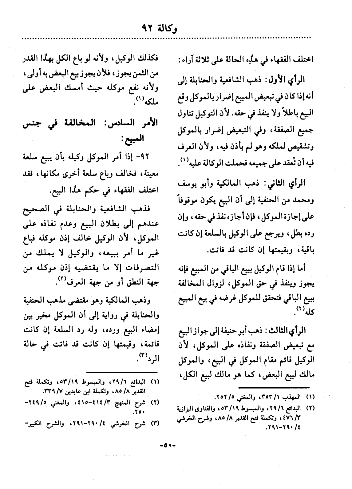 92 - إِذَا أَمَرَ الْمُوَكِّل وَكِيلَهُ بِأَنْ يَبِيعَ سِلْعَةً مُعَيَّنَةً، فَخَالَفَ وَبَاعَ سِلْعَةً أُخْرَى مَكَانَهَا، فَقَدِ اخْتَلَفَ الْفُقَهَاءُ فِي حُكْمِ هَذَا الْبَيْعِ.
