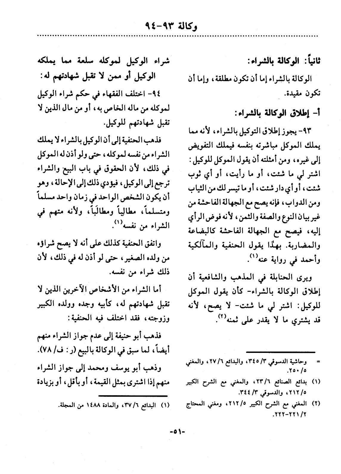 93 - يَجُوزُ إِطْلاَقُ التَّوْكِيل بِالشِّرَاءِ، لأَِّنَهُ مِمَّا يَمْلِكُ الْمَوَكِّل مُبَاشَرَتَهُ بِنَفْسِهِ فَيَمْلِكُ الْتَفْوِيضَ إِلَى غَيْرِهِ، وَمِنْ أَمْثِلَتِهِ أَنْ يَقُول الْمُوَكِّل لِلْوَكِيل: اشْتَرِ لِي مَا شِئْتَ، أَوْ مَا رَأَيْتَ، أَوْ أَيَّ ثَوْبٍ شِئْتَ، أَوْ أَيَّ دَارٍ شِئْتَ، أَوْ مَا تَيَسَّرَ لَكَ مِنَ الثِّيَابِ وَمِنَ الدَّوَابِ، فَإِنَّهُ يَصِحُّ مَعَ الْجَهَالَةِ الْفَاحِشَةِ مِنْ غَيْرِ بَيَانِ النَّوْعِ وَالصِّفَةِ وَالثَّمَنِ، لأَِّنَهُ فَوَّضَ الرَّأْيَ إِلَيْهِ، فَيَصِحُّ مَعَ الْجَهَالَةِ الْفَاحِشَةِ كَالْبِضَاعَةِ وَالْمُضَارَبَةِ. بِهَذَا يَقُول الْحَنَفِيَّةُ وَالْمَالِكِيَّةُ وَأَحْمَدُ فِي رِوَايَةٍ عَنْهُ. (1)