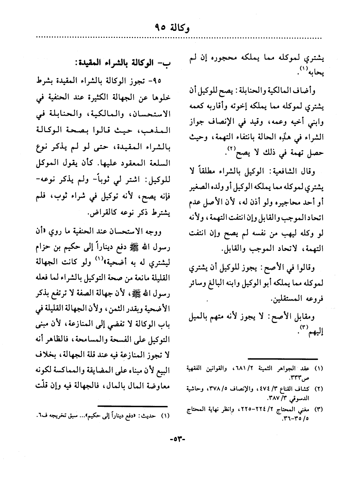 95 - تَجُوزُ الْوَكَالَةُ بِالشِّرَاءِ الْمُقَيَّدَةُ بِشَرْطِ خُلُوِّهَا عَنِ الْجَهَالَةِ الْكَثِيرَةِ عِنْدَ الْحَنَفِيَّةِ فِي الاِسْتِحْسَانِ، وَالْمَالِكِيَّةِ، وَالْحَنَابِلَةِ فِي الْمَذْهَبِ، حَيْثُ قَالُوا بِصِحَّةِ الْوَكَالَةِ بِالشِّرَاءِ الْمُقَيَّدَةِ، حَتَّى لَوْ لَمْ يَذْكُرْ نَوْعَ السِّلْعَةِ الْمَعْقُودِ عَلَيْهَا. كَأَنْ يَقُول الْمُوَكُّل لِلْوَكِيل: اشْتَرِ لِي ثَوْبًا - وَلَمْ يَذْكُرْ نَوْعَهُ - فِإِنَّهُ يَصِحُّ، لأَِنَّهُ تَوْكِيلٌ فِي شِرَاءِ ثَوْبٍ، فَلَمْ يَشْتَرِطْ ذِكْرَ نَوْعِهِ كَالْقِرَاضِ.
