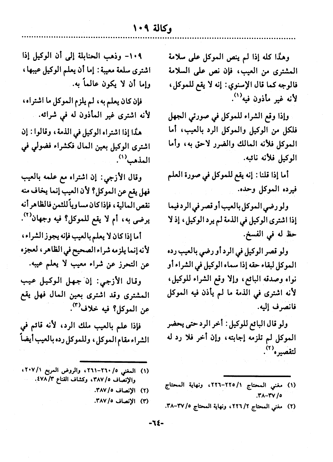 109 - وَذَهَبَ الْحَنَابِلَةُ إِلَى أَنَّ الْوَكِيل إِذَا اشْتَرَى سِلْعَةً مَعِيبَةً: إِمَّا أَنْ يَعْلَمَ الْوَكِيل عَيْبَهَا، وَإِمَّا أَنْ لاَ يَكُونَ عَالِمًا بِهِ.