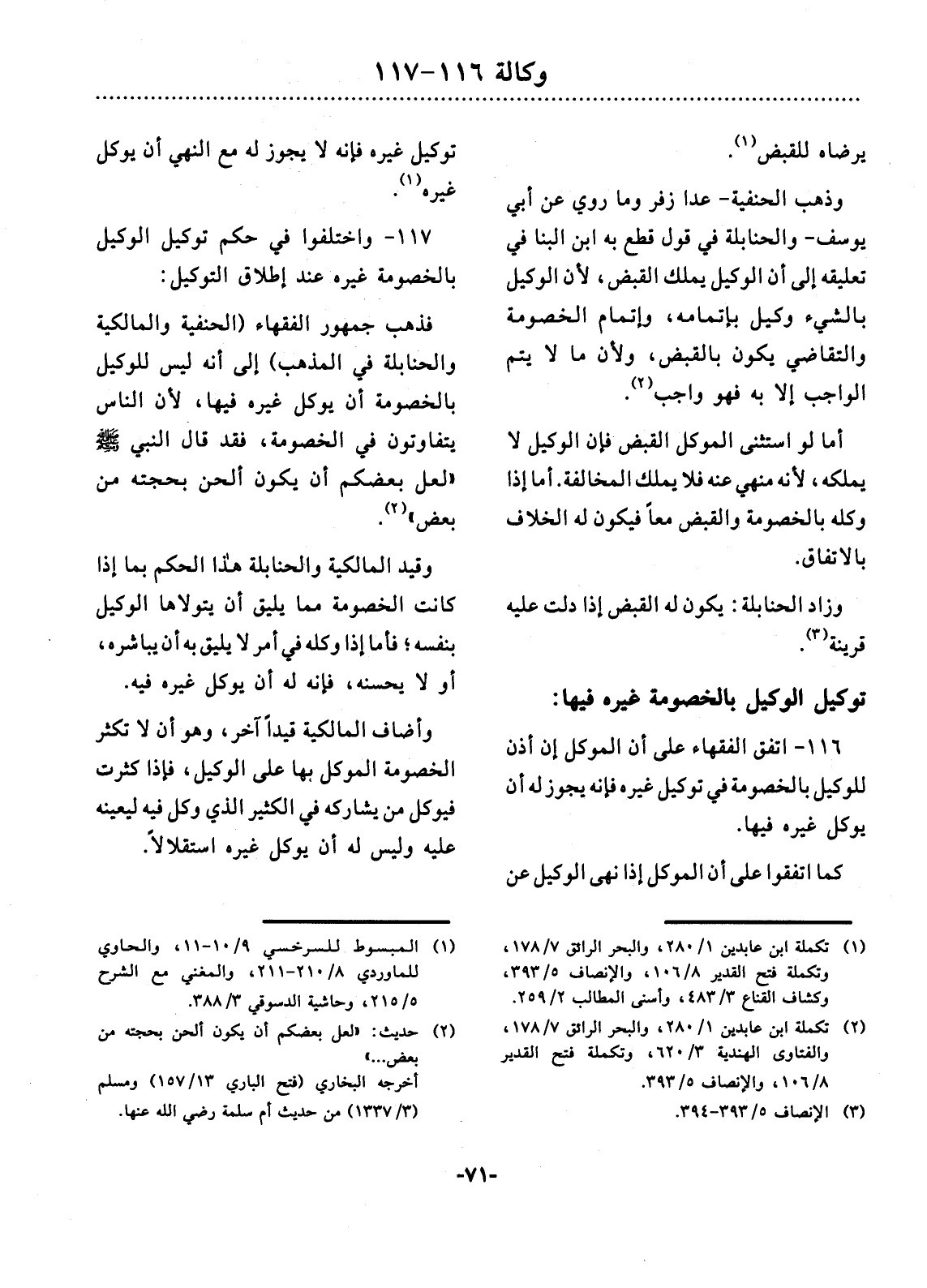 116 - اتَّفَقَ الْفُقَهَاءُ عَلَى أَنَّ الْمُوَكِّل إِنْ أَذِنَ لِلْوَكِيل بِالْخُصُومَةِ فِي تَوْكِيل غَيْرِهِ فَإِنَّهُ يَجُوزُ لَهُ أَنْ يُوَكِّل غَيْرَهُ فِيهَا.