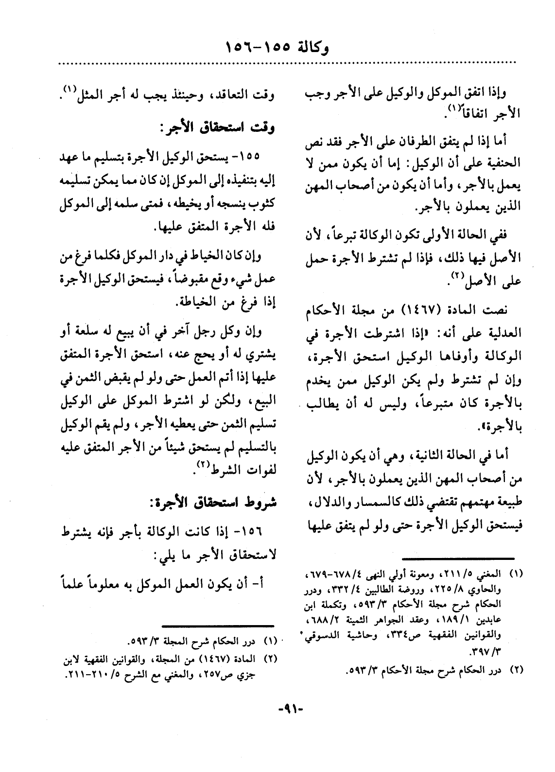155 ـ يَسْتَحِقُّ الْوَكِيل الأُْجْرَةَ بِتَسْلِيمِ مَا عُهِدَ إِلَيْهِ بِتَنْفِيذِهِ إِلَى الْمُوَكِّل إِنْ كَانَ مِمَّا يُمْكِنُ تَسْلِيمُهُ كَثَوْبٍ يَنْسِجُهُ أَوْ يَخِيطُهُ فَمَتَى سَلَّمَهُ إِلَى الْمُوَكِّل فَلَهُ الأُْجْرَةُ الْمُتَّفَقُ عَلَيْهَا.