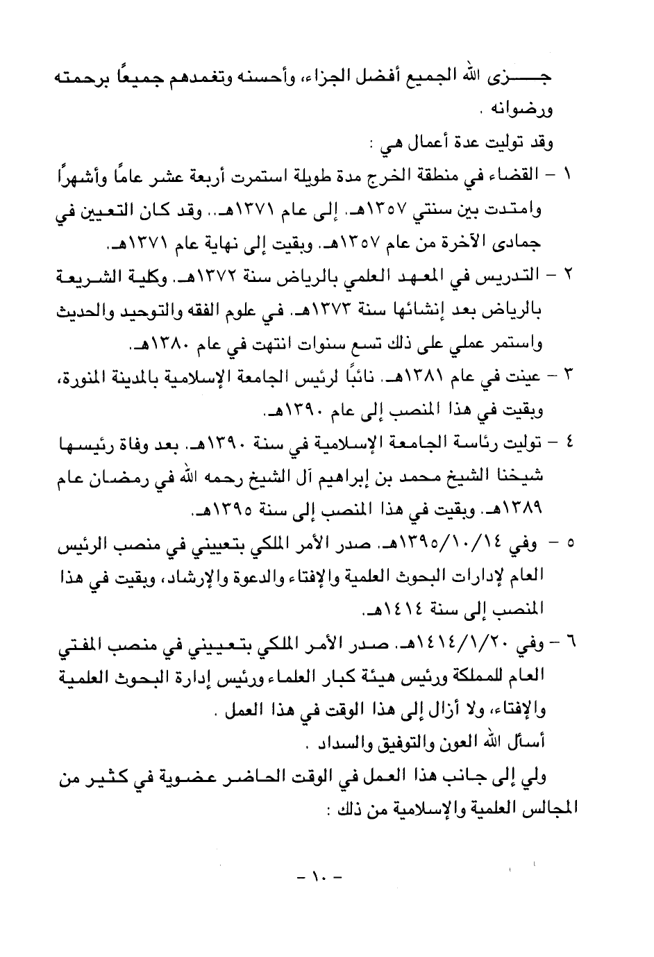 5 - وفي 14 \10 \ 1395 هـ. صدر الأمر الملكي بتعييني في منصب الرئيس العام لإدارات البحوث العلمية والإفتاء والدعوة والإرشاد، وبقيت في هذا المنصب إلى سنة 1414 هـ.