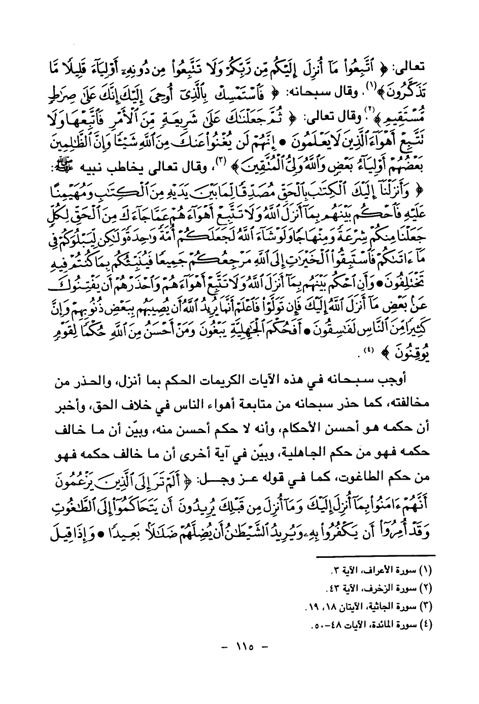 تعالى: {اتَّبِعُوا مَا أُنْزِلَ إِلَيْكُمْ مِنْ رَبِّكُمْ وَلَا تَتَّبِعُوا مِنْ دُونِهِ أَوْلِيَاءَ قَلِيلًا مَا تَذَكَّرُونَ} (¬1) وقال سبحانه: {فَاسْتَمْسِكْ بِالَّذِي أُوحِيَ إِلَيْكَ إِنَّكَ عَلَى صِرَاطٍ مُسْتَقِيمٍ} (¬2) وقال تعالى: {ثُمَّ جَعَلْنَاكَ عَلَى شَرِيعَةٍ مِنَ الْأَمْرِ فَاتَّبِعْهَا وَلَا تَتَّبِعْ أَهْوَاءَ الَّذِينَ لَا يَعْلَمُونَ} (¬3) {إِنَّهُمْ لَنْ يُغْنُوا عَنْكَ مِنَ اللَّهِ شَيْئًا وَإِنَّ الظَّالِمِينَ بَعْضُهُمْ أَوْلِيَاءُ بَعْضٍ وَاللَّهُ وَلِيُّ الْمُتَّقِينَ} (¬4) وقال تعالى يخاطب نبيه صلى الله عليه وسلم: {وَأَنْزَلْنَا إِلَيْكَ الْكِتَابَ بِالْحَقِّ مُصَدِّقًا لِمَا بَيْنَ يَدَيْهِ مِنَ الْكِتَابِ وَمُهَيْمِنًا عَلَيْهِ فَاحْكُمْ بَيْنَهُمْ بِمَا أَنْزَلَ اللَّهُ وَلَا تَتَّبِعْ أَهْوَاءَهُمْ عَمَّا جَاءَكَ مِنَ الْحَقِّ لِكُلٍّ جَعَلْنَا مِنْكُمْ شِرْعَةً وَمِنْهَاجًا وَلَوْ شَاءَ اللَّهُ لَجَعَلَكُمْ أُمَّةً وَاحِدَةً وَلَكِنْ لِيَبْلُوَكُمْ فِي مَا آتَاكُمْ فَاسْتَبِقُوا الْخَيْرَاتِ إِلَى اللَّهِ مَرْجِعُكُمْ جَمِيعًا فَيُنَبِّئُكُمْ بِمَا كُنْتُمْ فِيهِ تَخْتَلِفُونَ} (¬5) {وَأَنِ احْكُمْ بَيْنَهُمْ بِمَا أَنْزَلَ اللَّهُ وَلَا تَتَّبِعْ أَهْوَاءَهُمْ وَاحْذَرْهُمْ أَنْ يَفْتِنُوكَ عَنْ بَعْضِ مَا أَنْزَلَ اللَّهُ إِلَيْكَ فَإِنْ تَوَلَّوْا فَاعْلَمْ أَنَّمَا يُرِيدُ اللَّهُ أَنْ يُصِيبَهُمْ بِبَعْضِ ذُنُوبِهِمْ وَإِنَّ كَثِيرًا مِنَ النَّاسِ لَفَاسِقُونَ} (¬6) {أَفَحُكْمَ الْجَاهِلِيَّةِ يَبْغُونَ وَمَنْ أَحْسَنُ مِنَ اللَّهِ حُكْمًا لِقَوْمٍ يُوقِنُونَ} (¬7) أوجب سبحانه في هذه الآيات الكريمات الحكم بما أنزل، والحذر من مخالفته، كما حذر سبحانه من متابعة أهواء الناس في خلاف الحق، وأخبر أن حكمه هو أحسن الأحكام، وأنه لا حكم أحسن منه، وبين أن ما خالف حكمه فهو من حكم الجاهلية، وبين في آية أخرى أن ما خالف حكمه فهو من حكم الطاغوت، كما في قوله عز وجل: {أَلَمْ تَرَ إِلَى الَّذِينَ يَزْعُمُونَ أَنَّهُمْ آمَنُوا بِمَا أُنْزِلَ إِلَيْكَ وَمَا أُنْزِلَ مِنْ قَبْلِكَ يُرِيدُونَ أَنْ يَتَحَاكَمُوا إِلَى الطَّاغُوتِ وَقَدْ أُمِرُوا أَنْ يَكْفُرُوا بِهِ وَيُرِيدُ الشَّيْطَانُ أَنْ يُضِلَّهُمْ ضَلَالًا بَعِيدًا} (¬8) {وَإِذَا قِيلَ لَهُمْ تَعَالَوْا إِلَى مَا أَنْزَلَ اللَّهُ وَإِلَى الرَّسُولِ رَأَيْتَ الْمُنَافِقِينَ يَصُدُّونَ عَنْكَ صُدُودًا} (¬9)